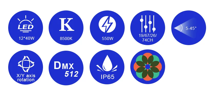 Operation mode | DMX512(19 CH / 67 CH / 26 CH / 74 CH),Sound-activated,Master/slave |