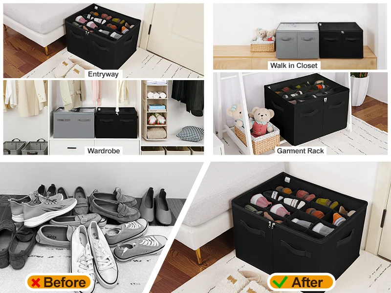 Shoe boxes can be placed in cabinets, closets, wardrobes, entryways, top shelves or just on the floor. Shoes organizer is available for walk in closet, living rooms, bedrooms, entrances, attics, garage, basements, RVs, dormitories and more.