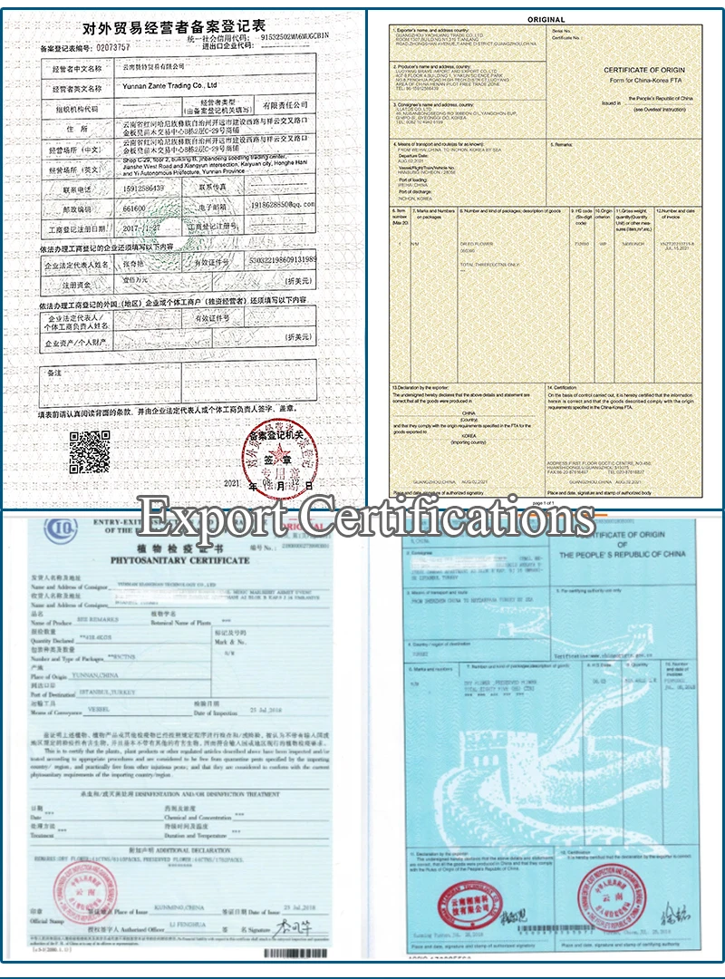 (CN) YunNan ZanTe always take good faith and quality as the basis of business, good service as the source of long-term cooperation, win-win business as the power of our development. We always provide high quality goods and serve customers well, so that we get high praise from customers, our customers' satisfaction score is usually 5 out of 5. Why are we suitable for you? -- Geographical Advantages located beside the KunMing DouNan International Flowers Industrail Park, which is the Largest Preserved & Dried Flowers Industrail Park in Asia. Hundreds of flowers farms around make fast produce, fast OEM, fast delivery guaranteed. And make it possible to quickly find out whatever special flowers products you need. -- Factory Direct Sale daily produce over 2,000 units of products. Product quality is guaranteed, Fast delivery is guaranteed, Good price is guaranteed, OEM is guaranteed. -- Well-served Shipping Services as long-term key customer of DHL, FedEx, UPS, TNT and EMS, safe & fast & low costs express shipping to all over the world is guaranteed. -- Top Good Flowers Expertise our flowers experts have about 10 years good experiences in flowers' picking, processing, packing, using. Flowers materials' quality are guaranteed, Flowers products' quality are guaranteed. | ![]() |