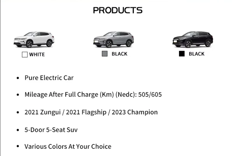 Models | BYD SONG PLUS EV 2023 champion 520KM luxury model | BYD SONG PLUS EV 2023 champion 520KM Premium model | Byd Song Plus EV 2023 champion version 520KM flagship | Byd Song Plus EV 2023 Champion edition 605KM Flagship PLUS | ||||