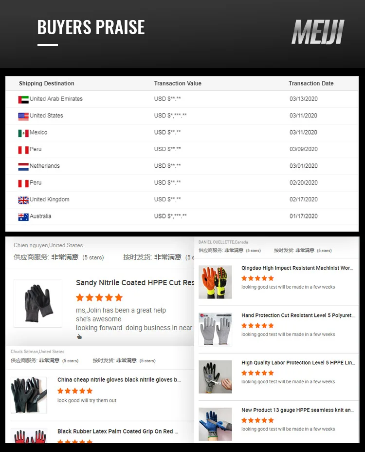 Glass cutting, sheet metal and sharp small parts handling, parts assembly, general duty, construction, etc Anti cut Level 5 latex coated glove 13gauge nylon/HPPE with glass fiber liner and Lycra Latex palm coating Excellent flexibility and fit, high level of anti-cut Washable, resistant to chemicals, water, and ultraviolet light Color as customer need Size : 8/M,9/L,10/XL Package:12 pairs/polybag, 120 pairs/carton | ||||||||