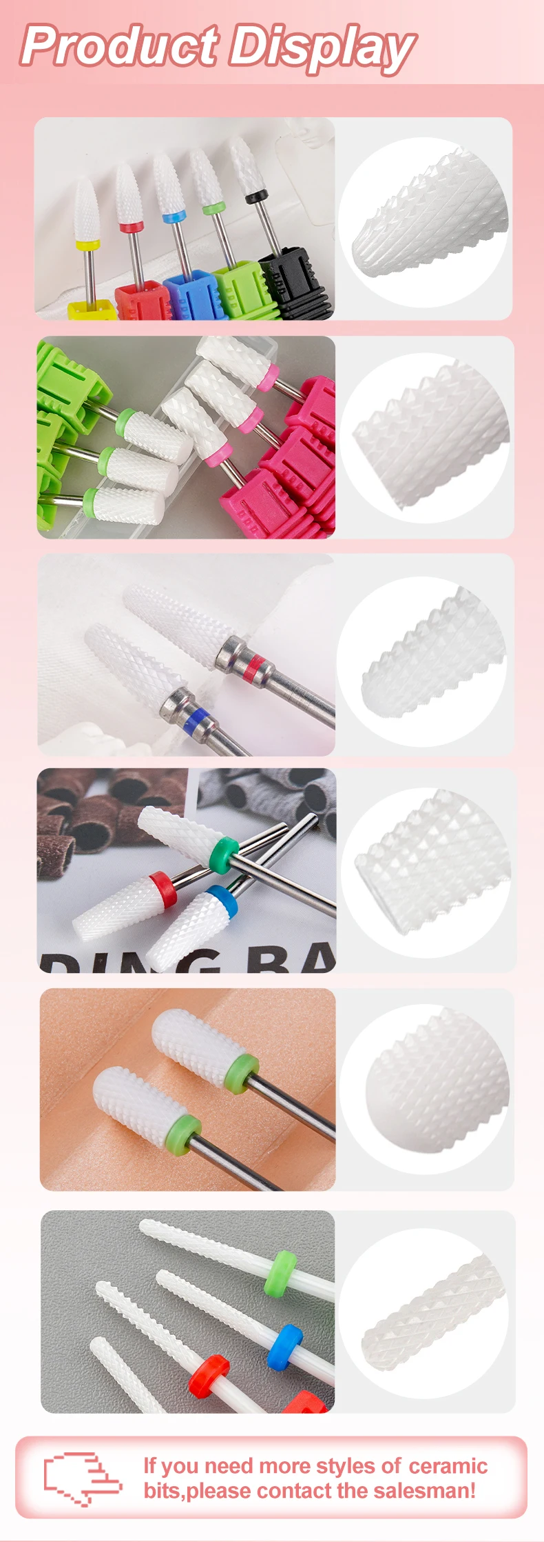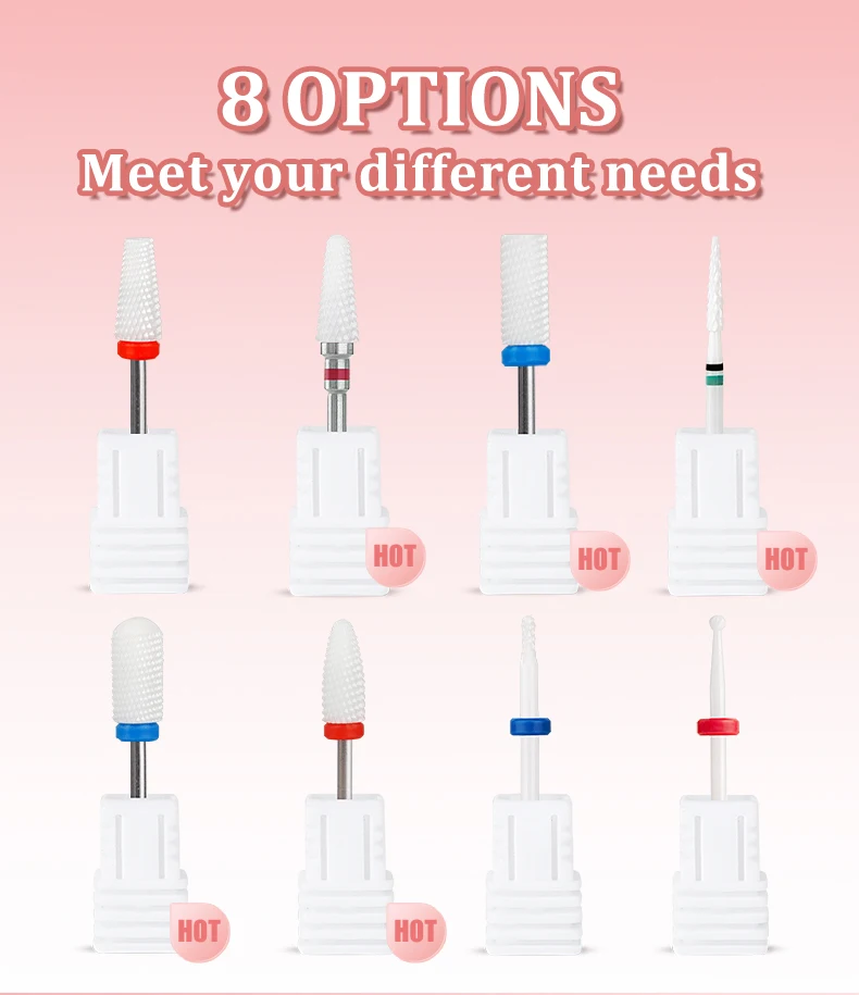 Usage: | Barrel, cone, needle, round, etc, for acrylic removing, nail cutting, cuticle cleaning, under nail cleaning, and smile line creating. | ||||||