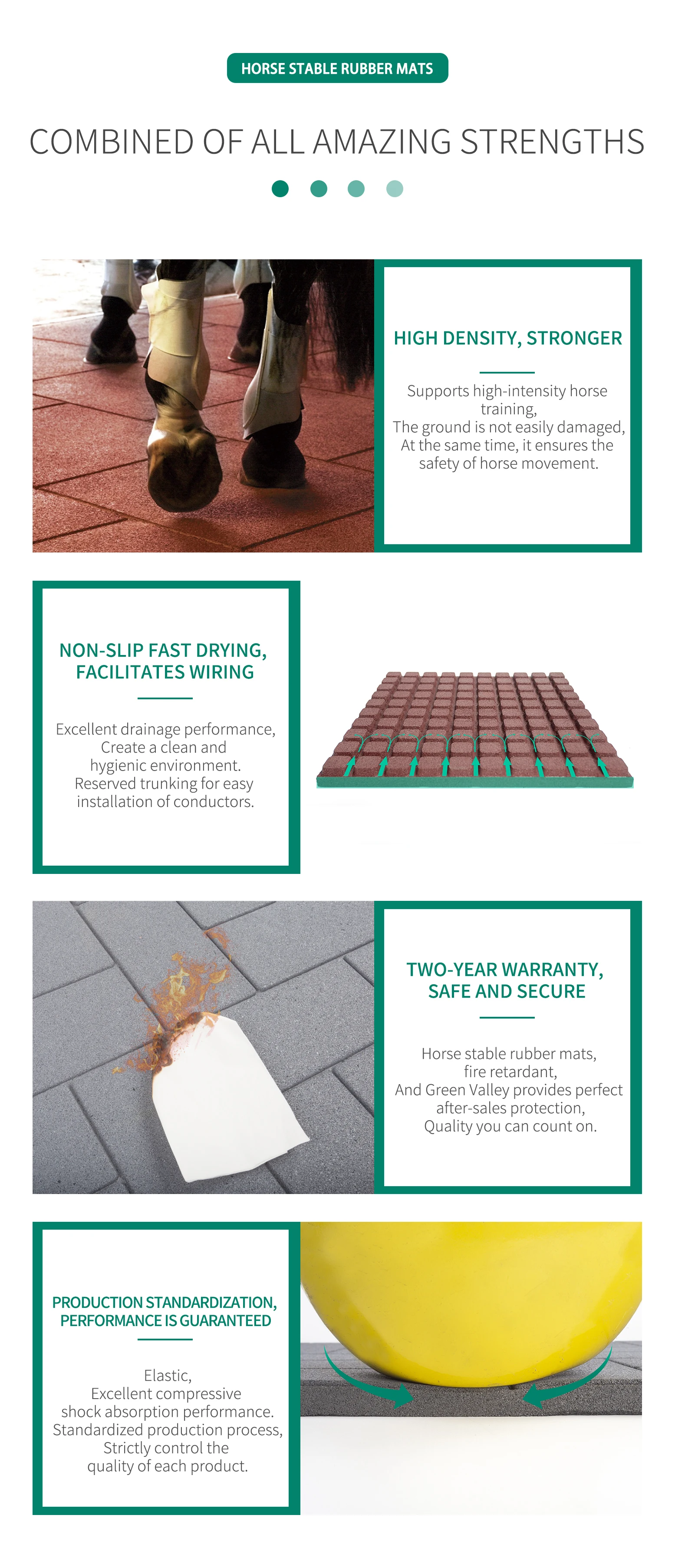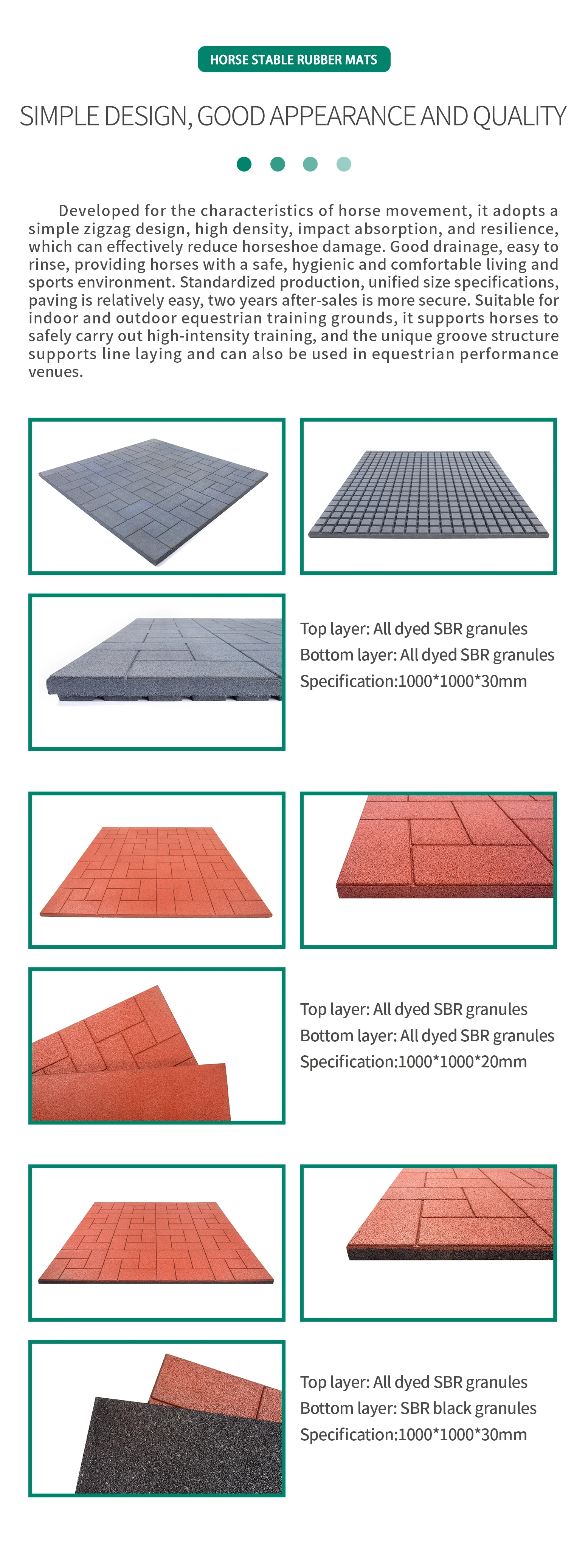Advantages | Developed for the characteristics of horse movement, it adopts a simple zigzag design, high density, impact absorption, and resilience, which can effectively reduce horseshoe damage. Good drainage, easy to rinse, providing horses with a safe, hygienic and comfortable living and sports environment. Standardized production, unified size specifications, paving is relatively easy, two years after-sales is more secure. |