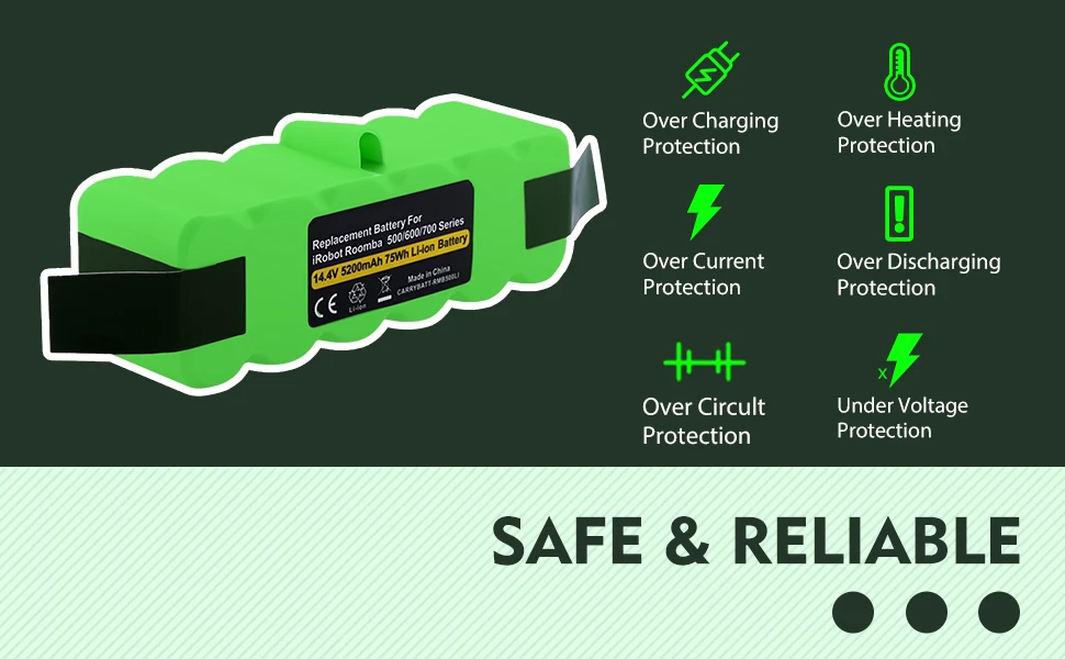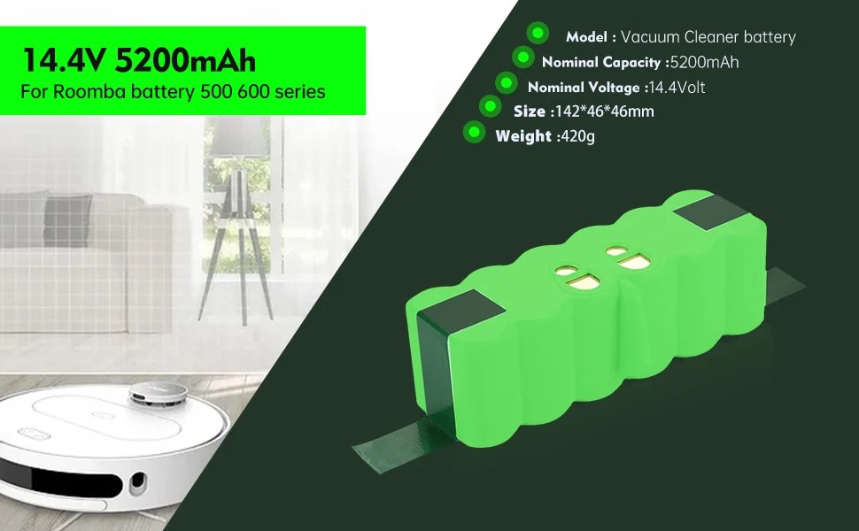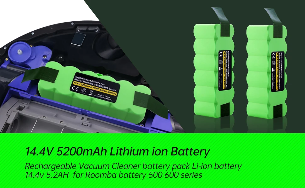Suitable for battery Model: | For iRobot Roomba 500 Series: R3,500, 510, 511, 520, 530, 531, 532, 535, 536, 537, 540, 545, 550, 551,552, 557, 560, 561, 562, 565, 570, 580, 581, 582, 585, 590, 595 For iRobot Roomba 600 Series: 600, 610, 620, 630, 650, 655, 660 For iRobot Roomba 700 Series: 700, 760, 770, 780, 790 For iRobot Roomba 800 Series:800, 870, 880 For iRobot Roomba 900 Series:900 ,980 |