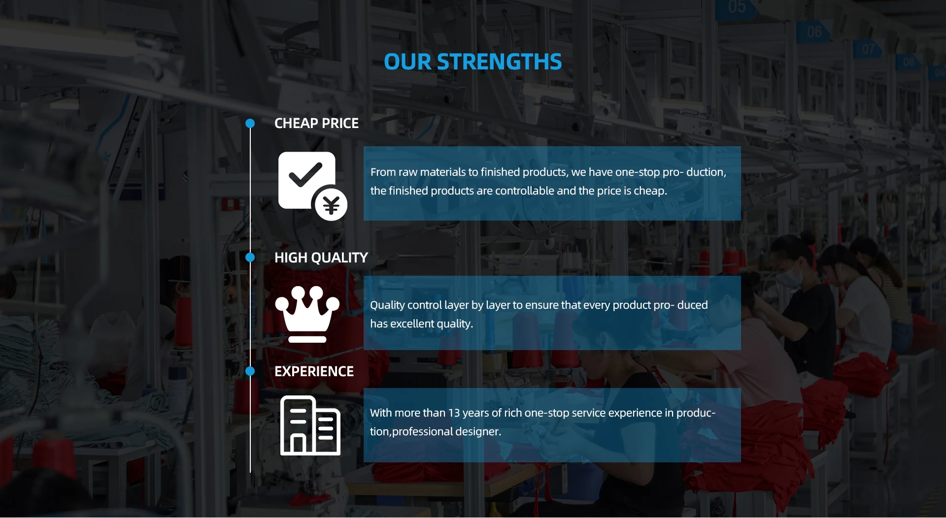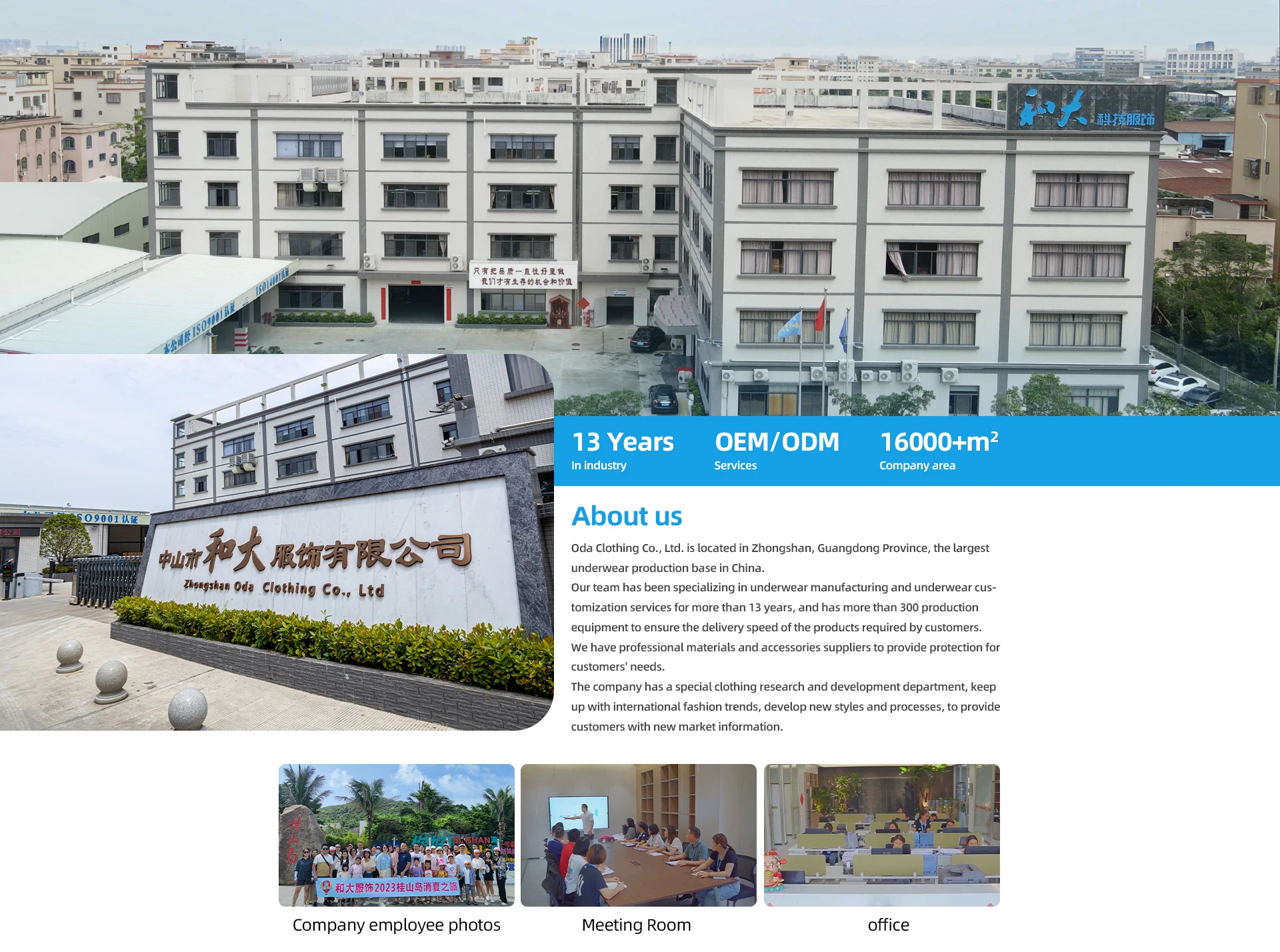 A:We are a company specializing in clothing manufacturing, with 13 years of experience.