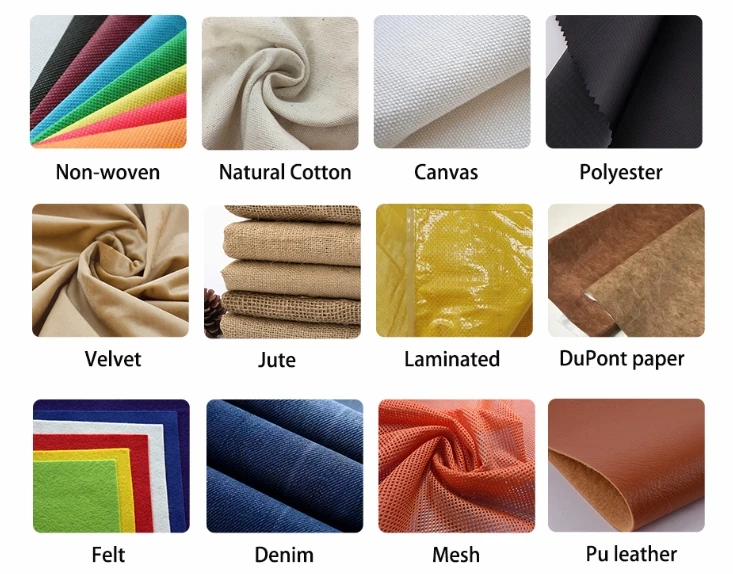 *Material | Canvas, cotton, nonwoven, pp woven, polyester, nylon, linen, felt, velvet, RPET, PVC or others | |