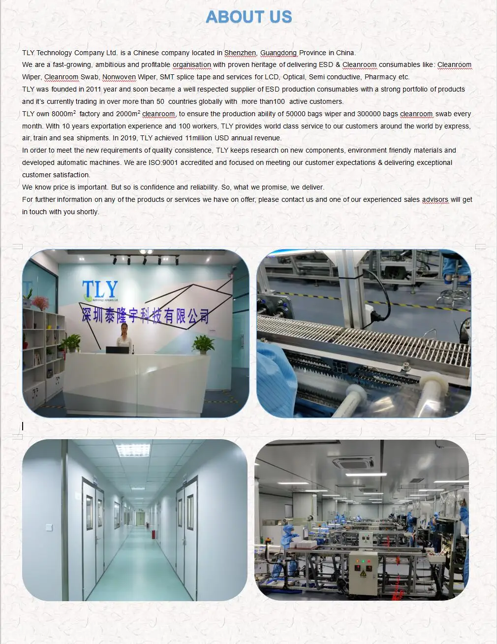 1. Free from silicone, amide and DOP 2. Low non-volatile residue 3. Low in both particles and ion content 4. Good absorbency 5. Compatible with most common solvents 6. No contaminating adhesive or coatings