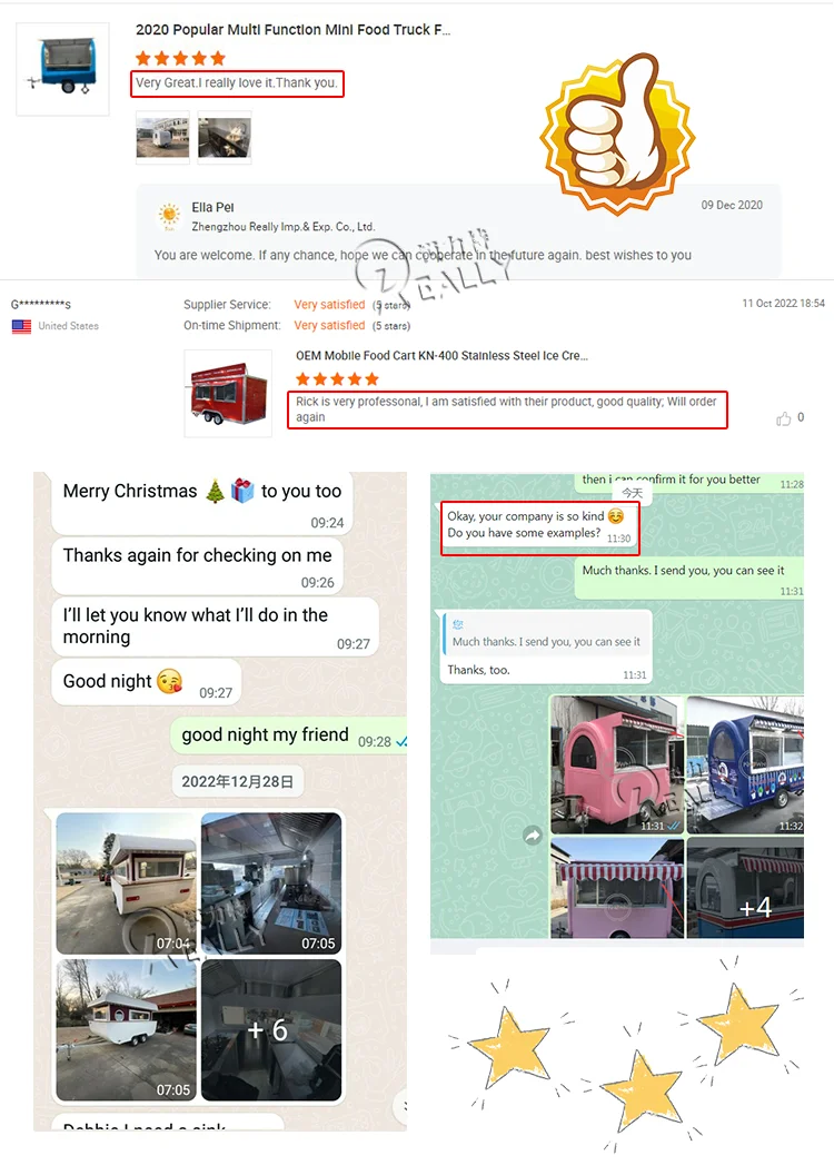 Zhengzhou Really Imp.& Exp. Co., Ltd. was established in march 2013, specializing in the production of mobile beer bar, various snack trucks, food kiosk, food cart mobile, food truck, and so on with COC/CE/DOT food trailers in Europe and other machinery. Due to our good design, professional mechanism, advanced technology and professional management, we have won a high reputation among our customers and always maintain a good relationship with them. |