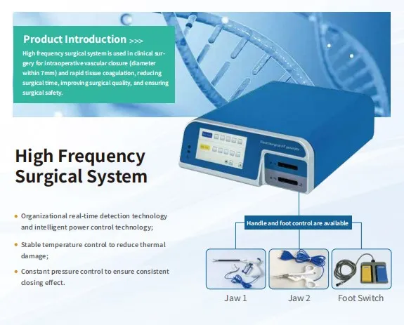 Working principle: Cutting or sealing by jaw tip thermal from high frequency high voltage currency . Component: HF generator,power wires, accessory connecting cable and foot control pedal.