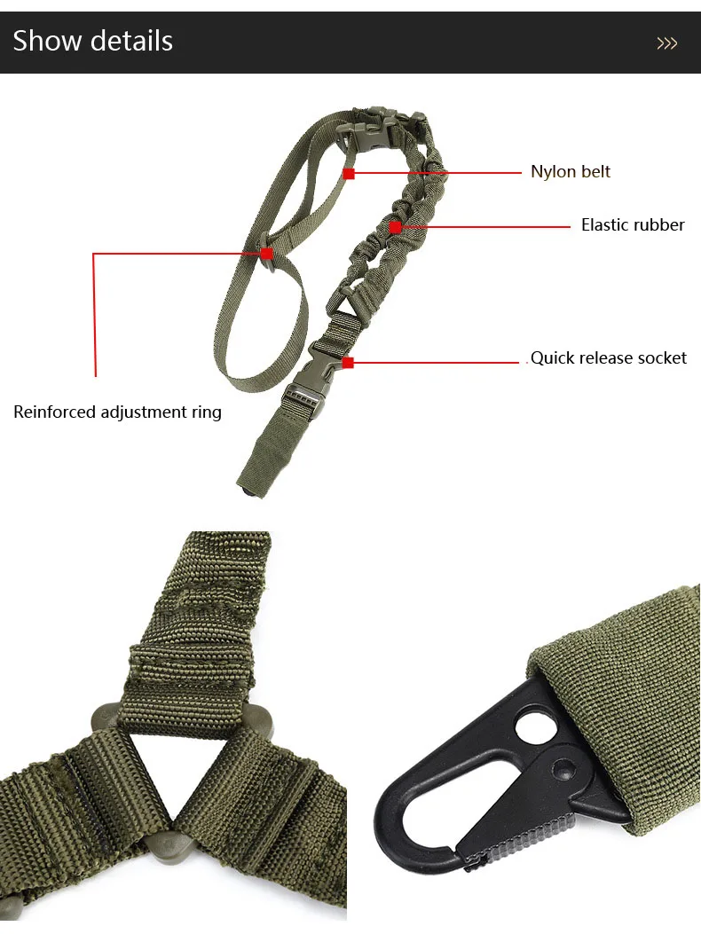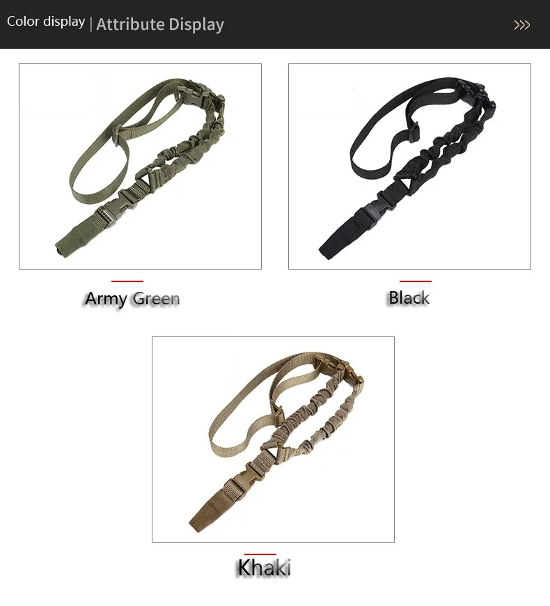 Product Information Product name: Single Point Sling Product packaging:PVC bag Applicable scene:various outdoor activities Product weight:about 200g Main material: Nylon webbing and elastic rubber,steel metal buckle Product function:To carry outdoor equipment for users