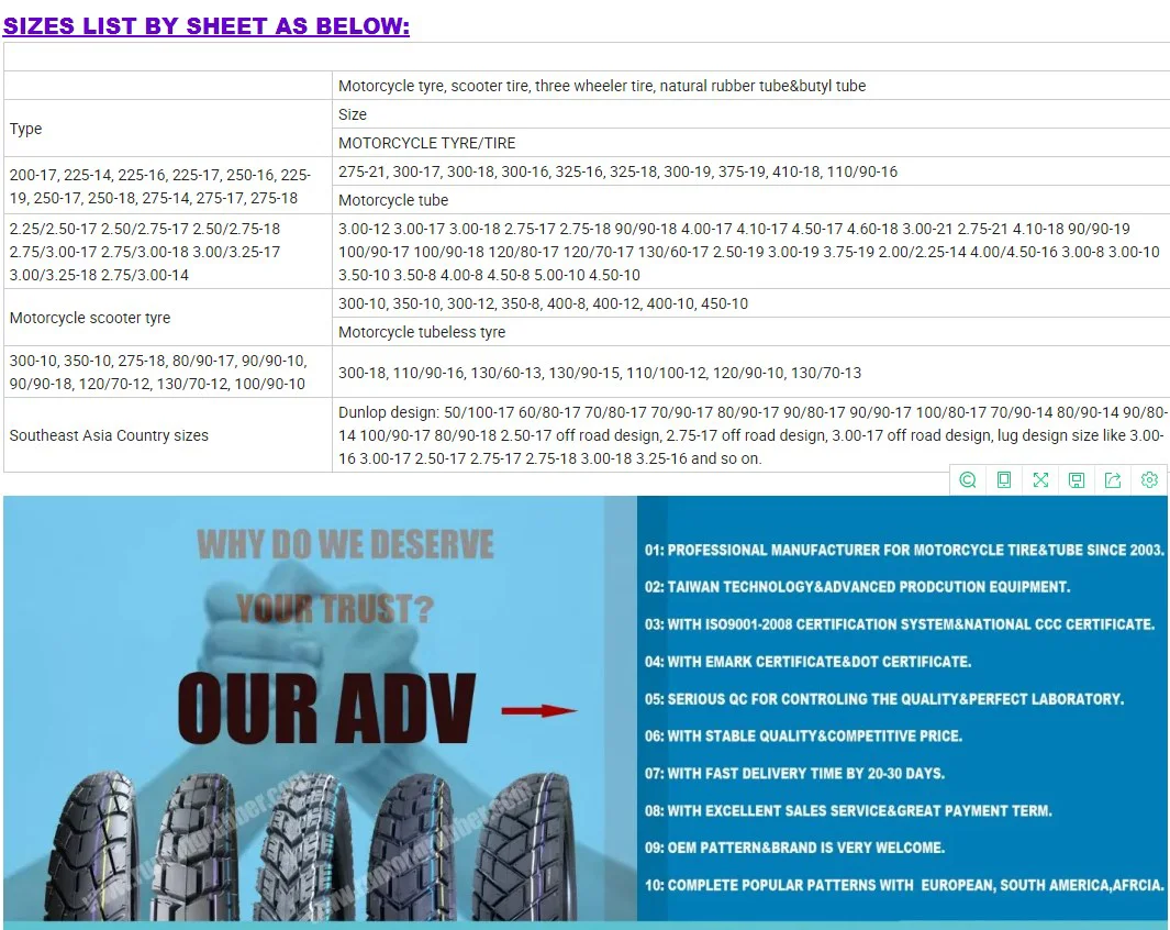 Till now we can produce more than 110 kinds of model and 270 kinds of different patterns for motorcycle tire only. The exact size