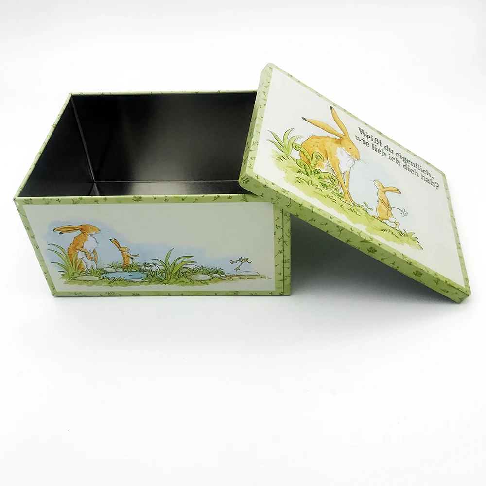 Product : | Easter Rabbit Fancy Chocolate Tin Box Right Angle Rectangle Metal Tinplate with Logo Print for Food Candies Cookies |