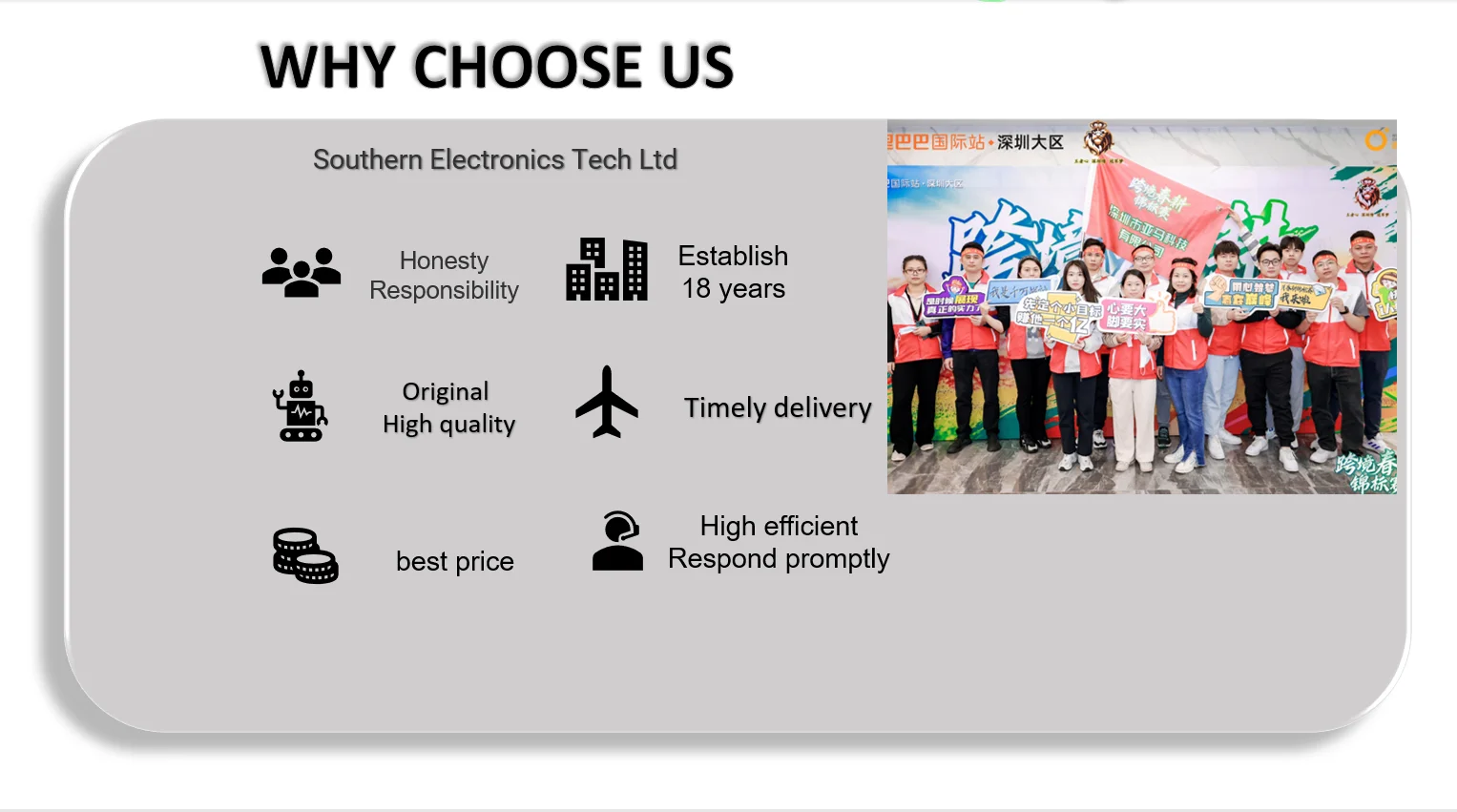 Southern electronics tech ltd Established in 2002, is a specialized global market distributor and broker of all electronic components and sourcing requirements. We are dedicated to providing our customers with impeccable service, quality and price.We offers an array of memory & semiconductor products. They include hard to find, obsolete Ics, chip tantalum capacitor, chip ceramic capacitor, chip resistor, diodes and transistor. Although our specialized service is in electronic components, our sourcing capabilities allow us to fulfill virtually any product requirement. Whether, you are seeking to eliminate channels or simply trying to reduce cost, southern electronics tech ltd is the " One Stop Shop" for all your sourcing needs. Southern electronics tech ltd Established in 2002, is a specialized global market distributor and broker of all electronic components and sourcing requirements. We are dedicated to providing our customers with impeccable service, quality and price.We offers an array of memory & semiconductor products. They include hard to find, obsolete Ics, chip tantalum capacitor, chip ceramic capacitor, chip resistor, diodes and transistor. Although our specialized service is in electronic components, our sourcing capabilities allow us to fulfill virtually any product requirement. Whether, you are seeking to eliminate channels or simply trying to reduce cost, southern electronics tech ltd is the " One Stop Shop" for all your sourcing needs.