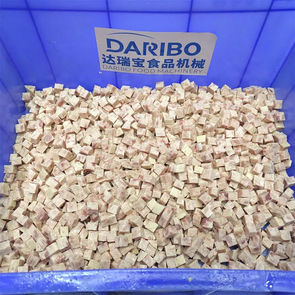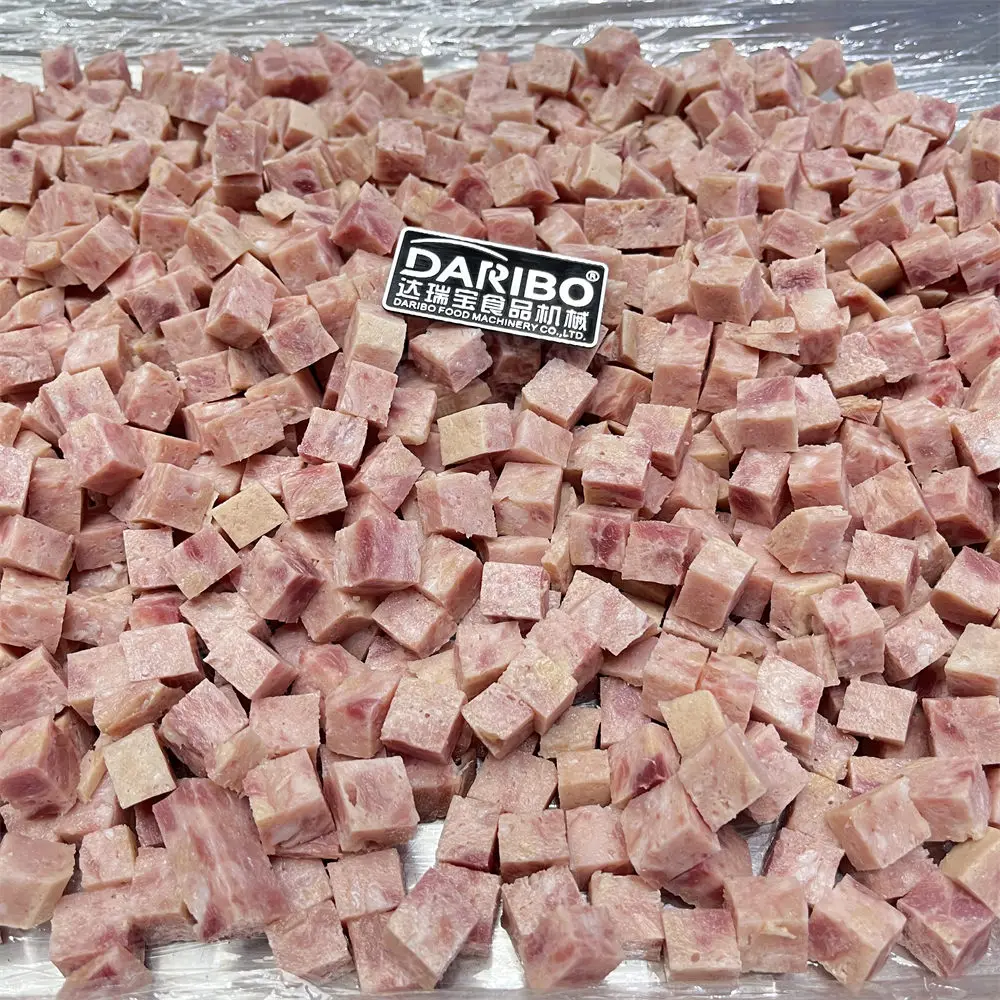 The machine is suitable for the cutting of cold fresh meat, cooked meat, poultry, fish, and combined meat products. It solves the problem of cutting and crushing cooked meat and combined products by customers. The cutting quality is good, it can be used for multiple purposes in one machine, and the production efficiency is high. The machine is designed and manufactured with reference to German machinery. It is sliced by double knives and cut by a disc cutter group into dice. Realize product cutting and fast packaging. The cutting specifications can be made according to user requirements, which is convenient for cleaning and meets food hygiene requirements.