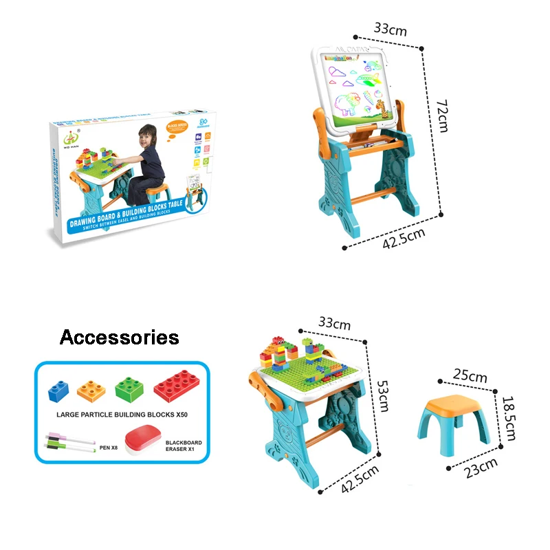 Description | 2 in 1 multi function drawing table large particle building blocks learning desk writing table education toy for kid with pens | MOQ | 8 sets |