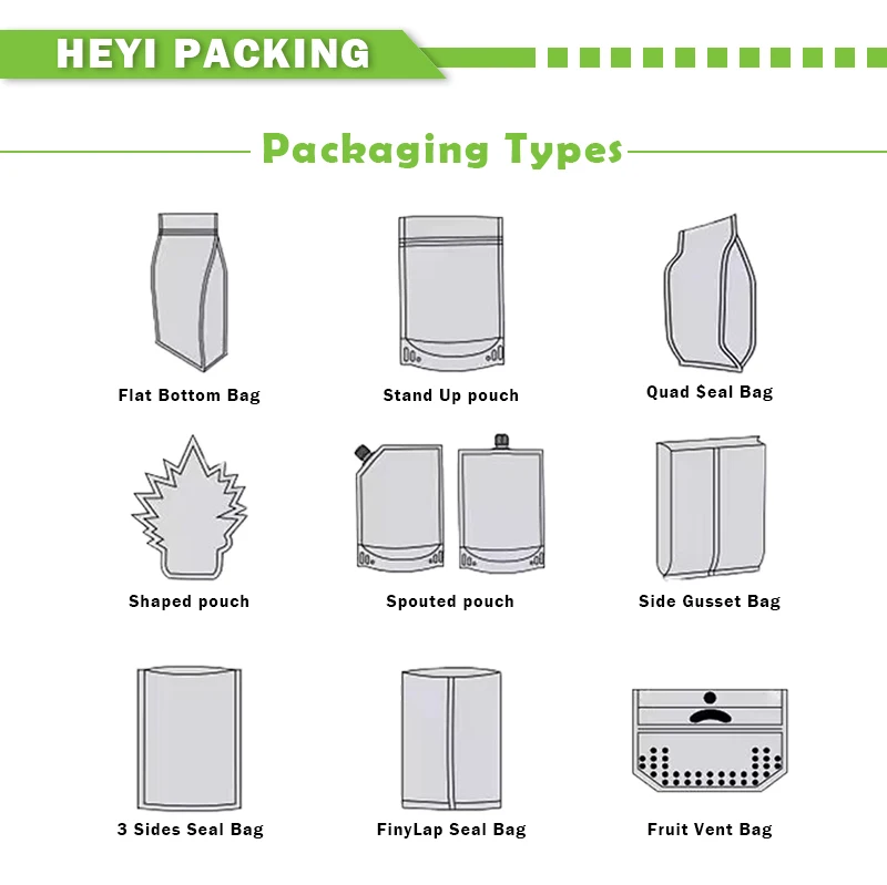 Free design packaging bag's types.eg:Stand up bag; Flat bottom bag; 3 sides seal bag; Middle seal bag; |