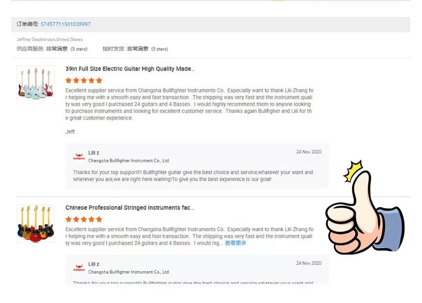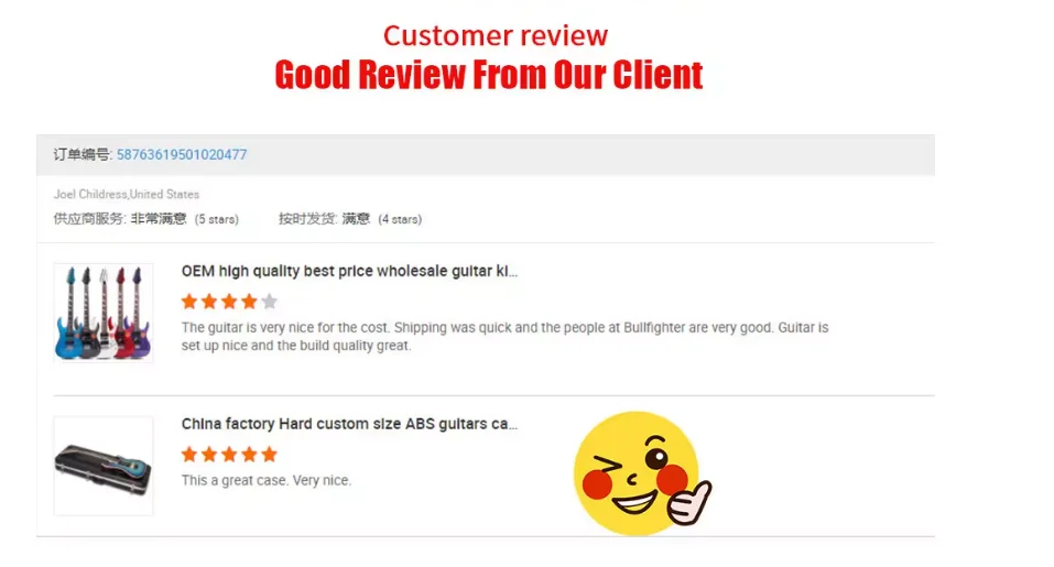 1.What is the minimum order quantity ? As first cooperation ,you can choose one or two pcs models from our stock to check our handcrafted and sound .If confirmed order ,we can give your MOQ depend on different models 2.How do you guarantee the Quality ? For the quality if have any problem we will treat it positively. If the accessories have problems we will send the replacement accessories to customer immediately. If easy problem we can contact and told you the step by step till problems are solved. So do not worried about this, we are responsible for our products. 3.How long is the quality guarantee ? For quality guarantee for one year no human damage. 4.How long the delivery time? A.stock models , 1-3days after received payments B.For OEM delivery times: 30 days or so after received your deposit. Guitar delivery times: 45 days or so after received your deposit. 5.What is your payments terms ? For stock models : 100% payment before shipment For OEM/ODM: 30%TT deposit first, balance before shippment. 6.What is the payment methods? TT / Western Union/ Paypal/TA 7.How much for the shipment cost ? At first ,please let us know the mode of transport (by express or by air or by sea ) and also please provide us your address or airport or sea port and your order quantities,we will check the shipment cost for you asap. Any questions please feel free to contact me.