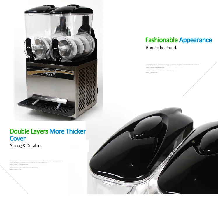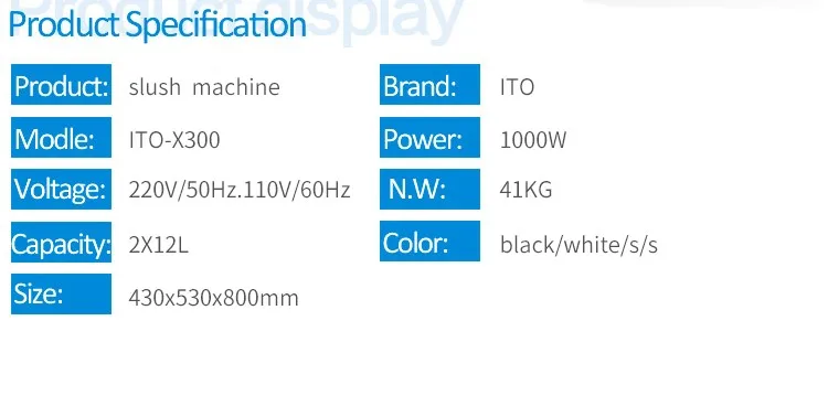 X-300 | Two tanks slush machine 2x12L | 220V/50Hz,110V/60Hz | 1000W | R404A/350G | 41kg | 430x530x800mm |