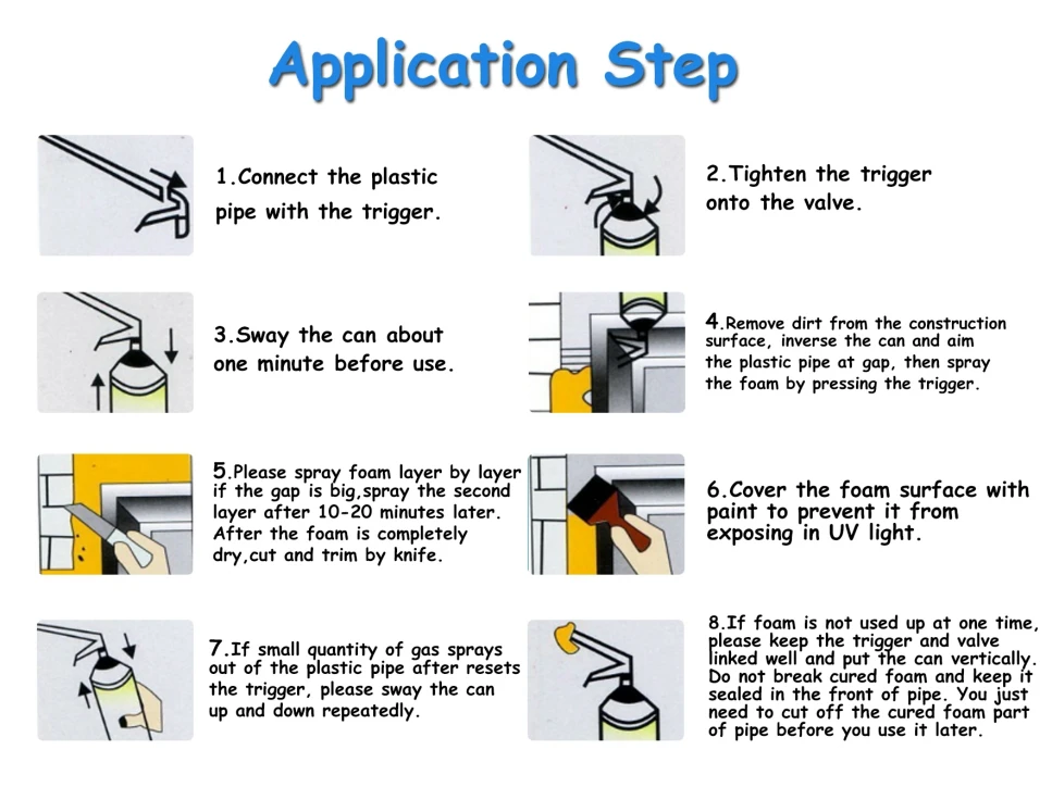 Remove cap and screw the straw firmly onto the valve. Shake the canister vigorously prior to use at least 20 times. To apply foam, turn the canister upside down and press the adaptor. Half fill the cavity and, in case of low humidity, lightly spray the foam with water. The foam will expand to fill the rest. When fixing window frames, use spacers and wedges to hold the frame in place for approximately 24 hours until the foam is fully cured. Protect eyes and wear gloves and working clothes. Floor-covering and furniture to be covered with paper or plastic foil. Joints wider and deeper than 4 cm should be filled in multiple layers. Waiting time between applications 15-30 minutes. Before each application lightly spray with water. | ||