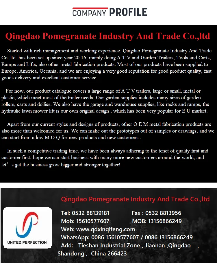 United Perfection Co., Ltd. is new established but with long history of exporting experience ,we have been supplying to many countries cross Europe , Australia, US, Canada..with all kinds of Garden Tools, Trailers , Carts... OEM for steel fabrication is also welcomed ! We focus on a series of fashion tools, a wide range of diversity, reasonable price and on-time delivery.
