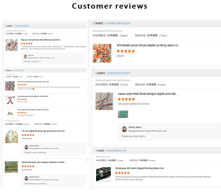 Product Description | Design: Thousands of high-end fashion designs for choice and Accept Custom Designs Color : Customized,You choose Pantone code,and we change for you Supply Type: Make-to-Order, you can choose any types of base fabric. Technology: Ink-jet Digital Print Feature:Eco-friendly,Skin-friendly, Breathable Usage: Dress, Garment,Trousers Place of origin: Shanghai, China |