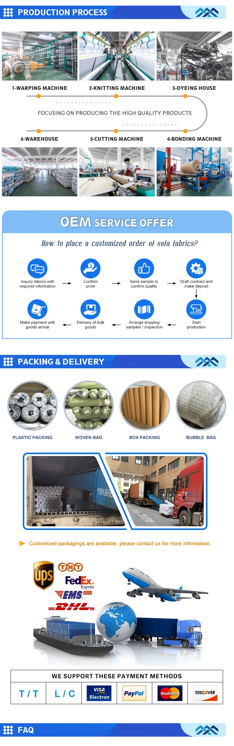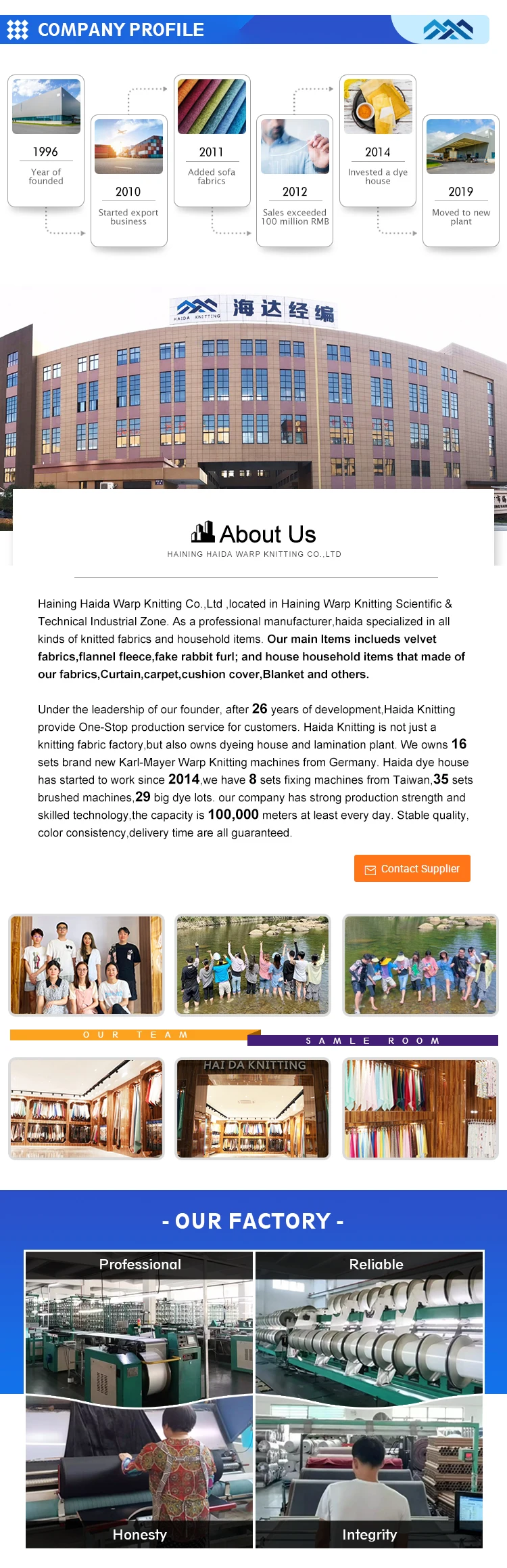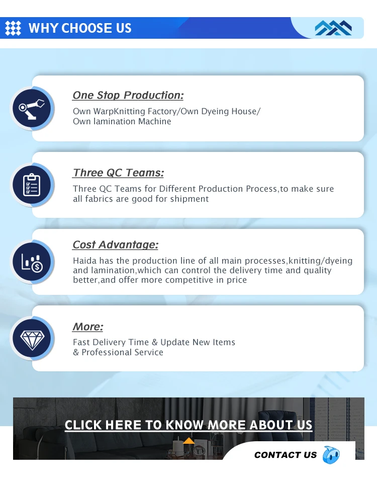 Our Advantage: | One-Stop Production Manufactory: 1. Own Warp Knitting Machines – All are from Germany Karl Mayer 2. Own Dye House – Capacity 2*40HQ Containers every day. 3. Own Bonding Machine and Prints Machine, update new designs every month. |