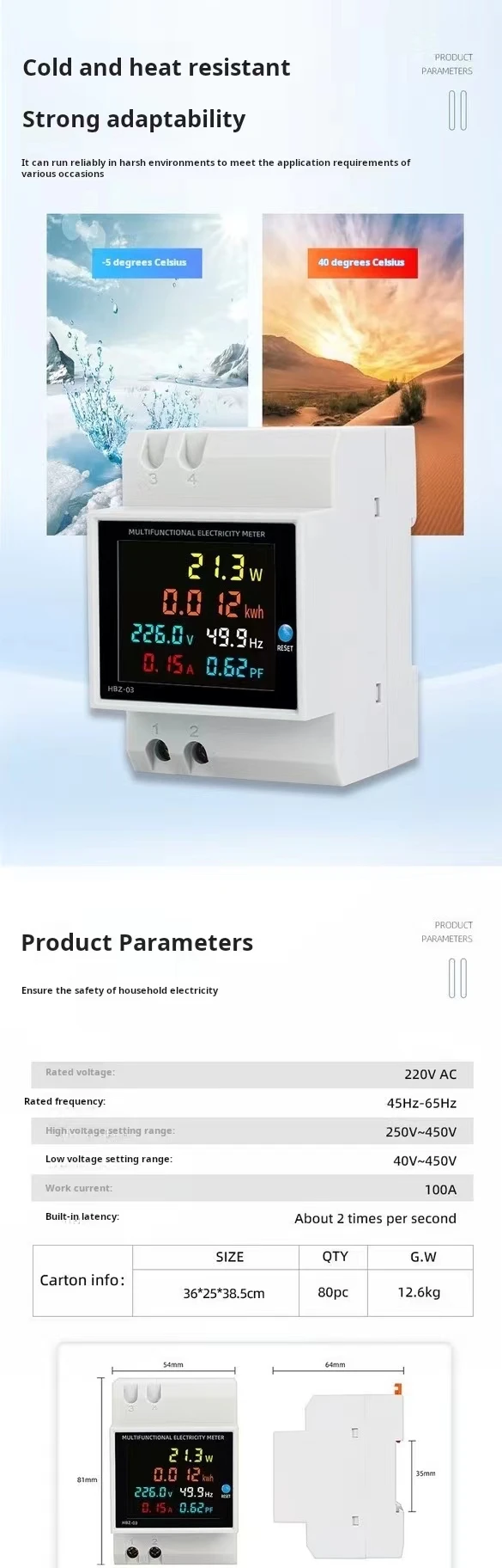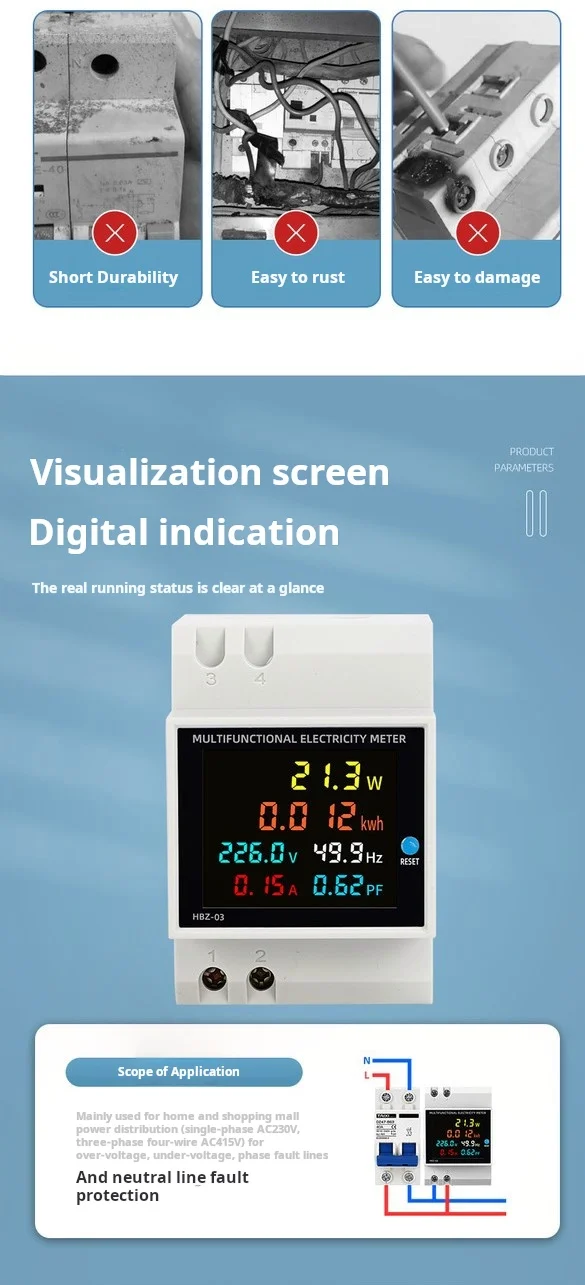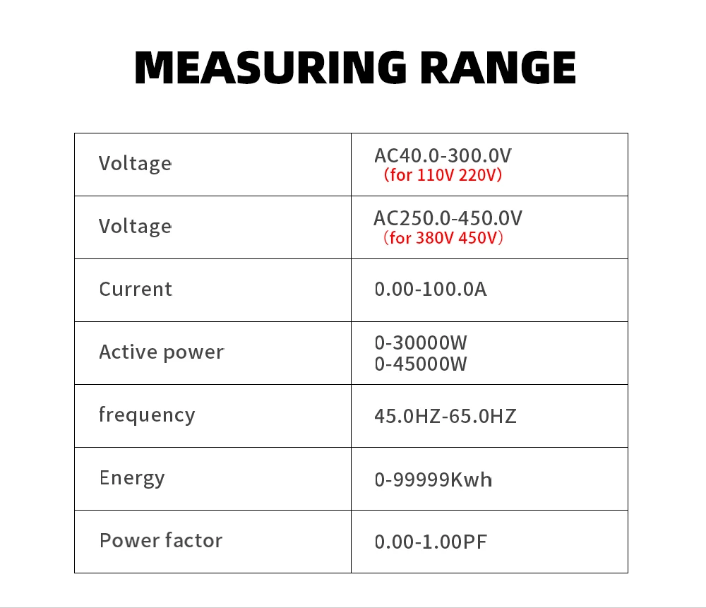 | AC voltage | AC 40.0-300.0V or AC 250.0-450.0V (You should select one type of the meter in your order) The measuring range 40-300V without limitation, and it can be used in grid power, photovoltaic and inverter current 250-450V only can use for 380V |