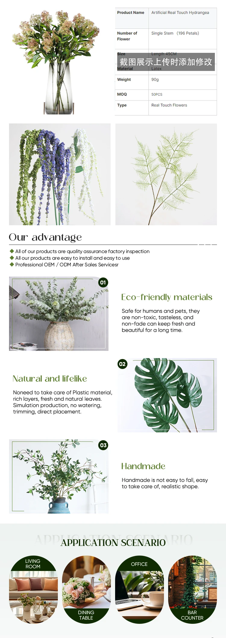 No need to take care of Plastic material, rich layers, fresh and natural leaves. Simulation production, no watering, trimming, direct placement.