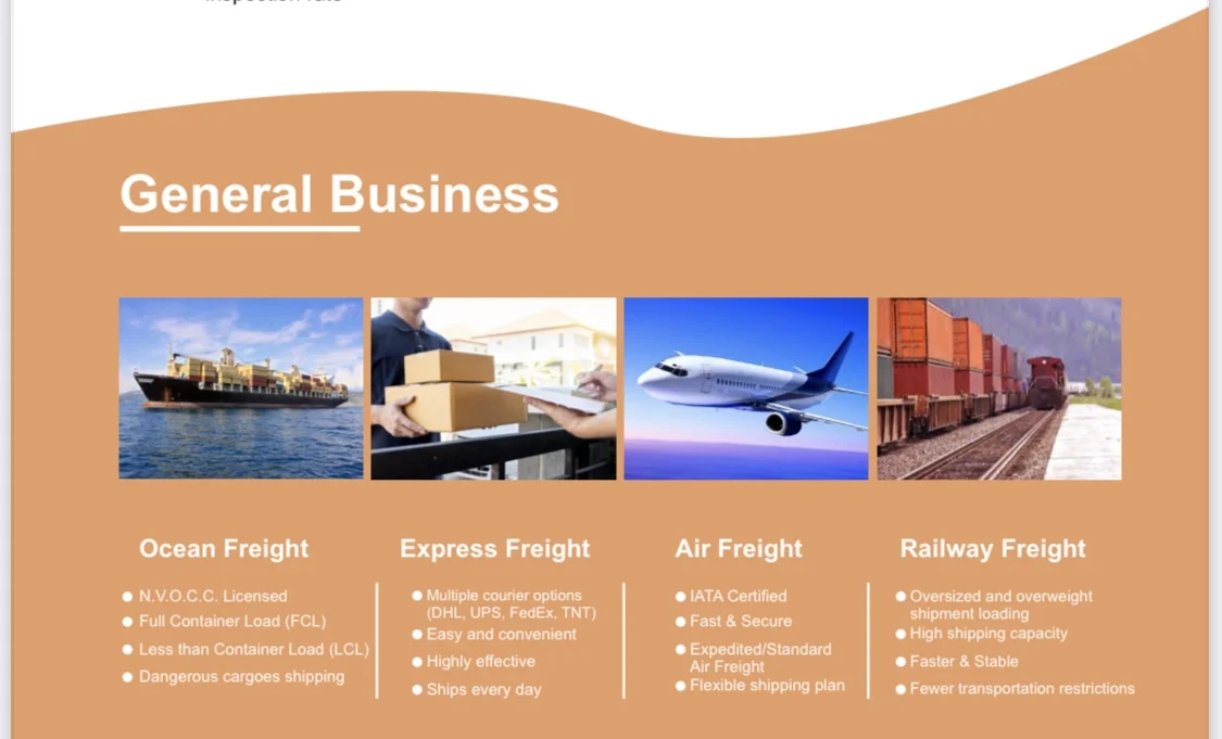 5.Railway shipping dervice:Provide varioud railway service from China to worldwide. Europe, Southeast Asian countries, est. Railway service faster than sea freight and cheaper than air freight.