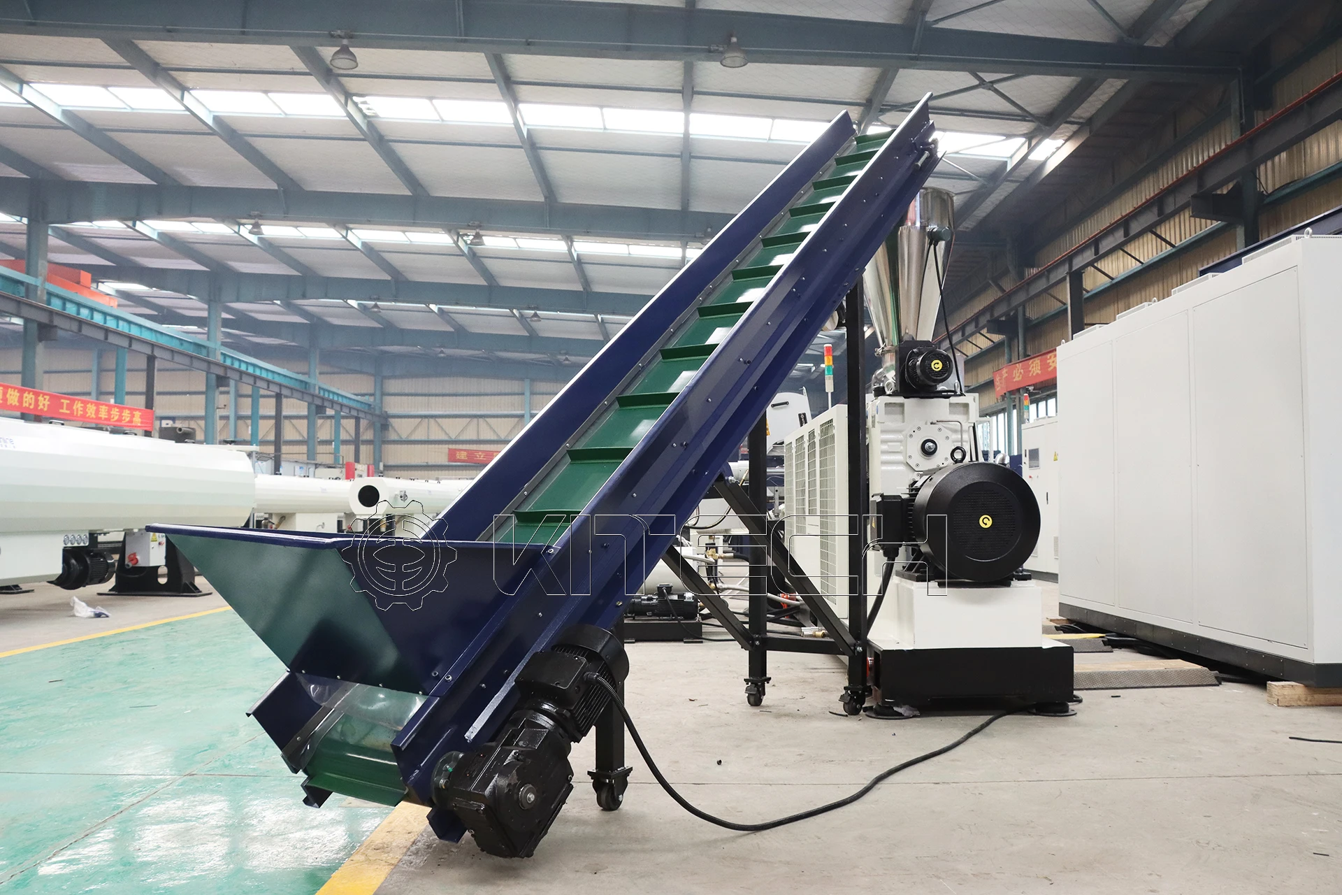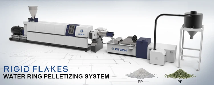 KSP series single screw extrusion and pelletizing system combines quantitative feeding, high efficiency extruder,different types of filter and different types of pelletizer by modular design. It provides best solution for PE, PP, PS, ABS, PET, PA and many other rigid plastic regrind recycling.