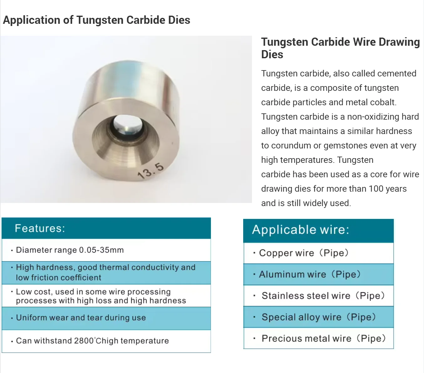 Its working life is 15-25 times than the working life of tungsten carbide dies so that improving efficiency and saving cost for user.