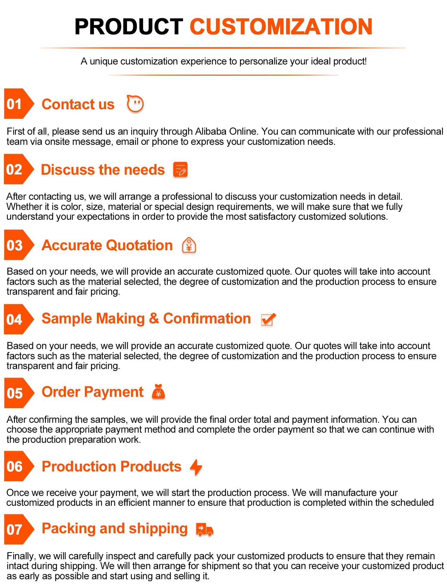 First let us know your requirements or application for the product. Secondly, we make precise quotation according to your requirements. Third, produce samples, let customers confirm the samples and pay the deposit to get the official order. Fourth, we arrange to produce the products. Finally, the products are packed and shipped on schedule.