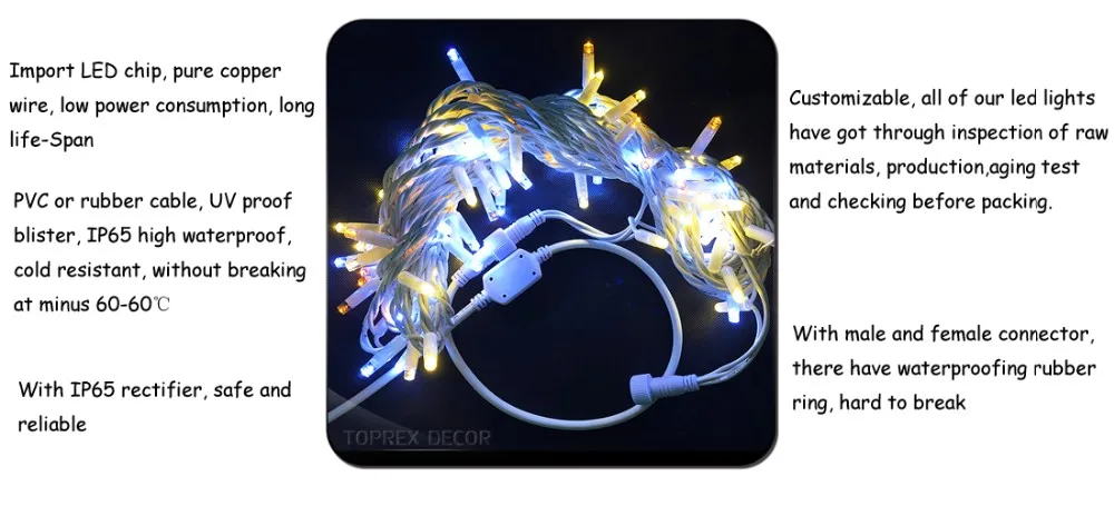 Material | Import LED chip, pure copper wire, PVC cable, iron frame |