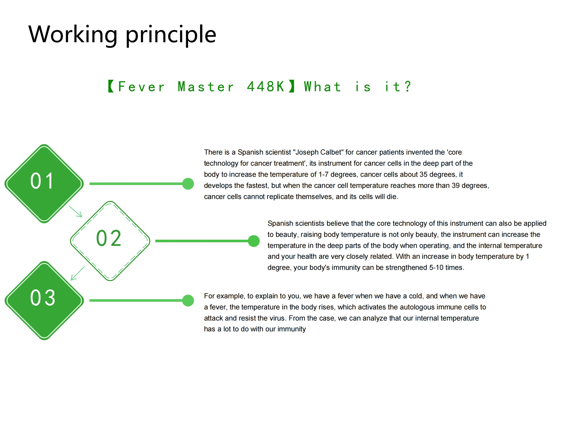 Products Description What is the 448k indiba?There is a Spanish scientist "Mr josep calbet" to cancer patients invented 'cancer core technology ", its instrument for the deep parts of the cancer cells temperature 1-7 degrees, cancer cells about 35 degrees, it developed the fastest, but cancer cell temperature above 39 degrees, cancer cells can't replicate themselves, and its cells will die. Spanish scientists believe that the core technology of the instrument can also be applied to beauty. Improving body temperature is not only beauty, but also improves temperature in the deep parts of the body, and body temperature is very closely related to your health.Your body temperature by 1 degree increases your body's immunity by 5-10 times. The 448k thermocontroller can safely deliver energy to the deep parts of the body through the high weekly wave of 448KHZ, improving the internal temperature and immunity of the body. Company Introduction FAQ Q1: Do you offer a warranty for your products? Yes, we do. Our machines come with a comprehensive warranty package. The main machine is covered for 1-2 years, while handles, treatment heads, and parts are guaranteed for 3-6 months with free replacement.
