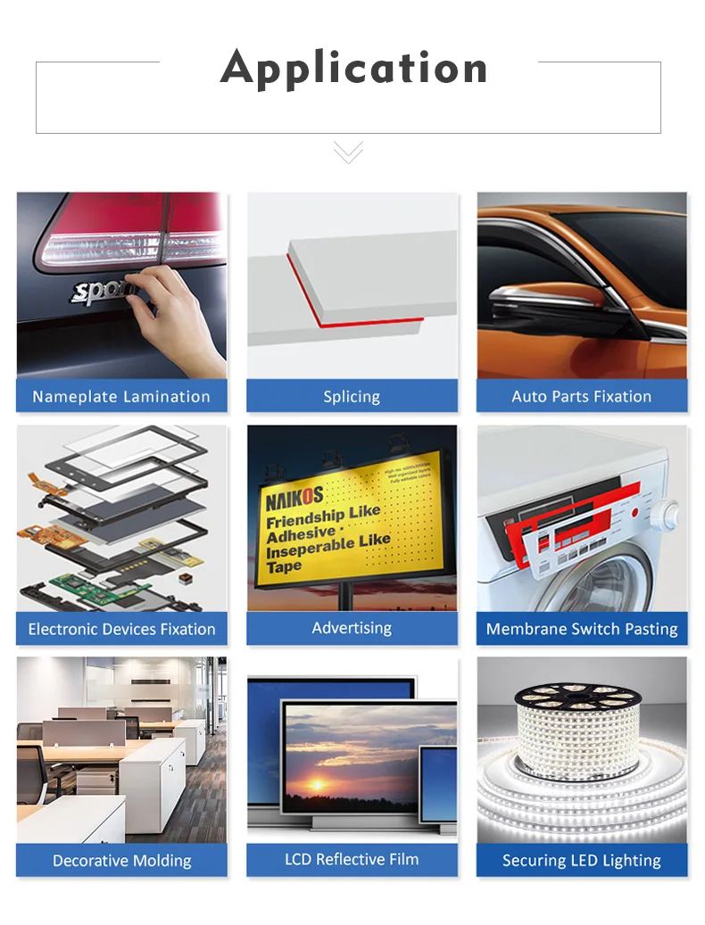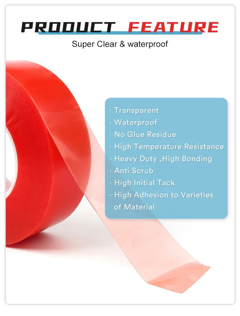 Feature | Transparent, Waterproof, High Temperature Resistance, Heavy Duty ,High Bonding, Anti Scrub, High Initial Tack, No Glue Residue, High Adhesion to Varieties of Material |