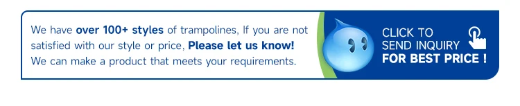 Q1. Why choose us ? 1. Best price: we are direct factory we can give u the best price. 2. Quick reply: All your inquiry can be replled within 24 hours. 3. Month Production capacity we can supply 10000pcs trampolines/20000pcs mini trampoline/20000pcs swings per monthd. 4. Timely shipment: we have more than 100 experienced and skiled employees , all production plan are contorted with strict ERP management, that's why we can glve you on-time delivery.