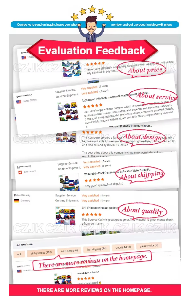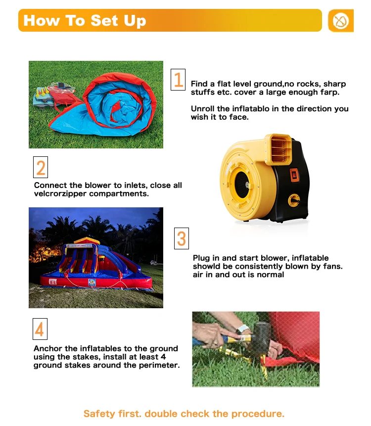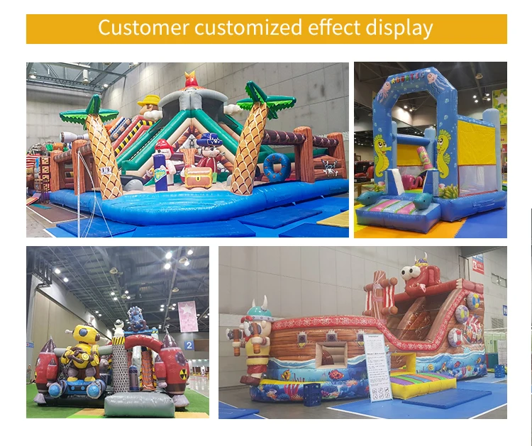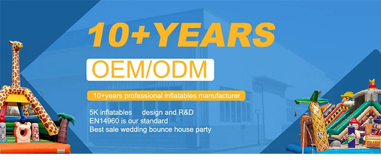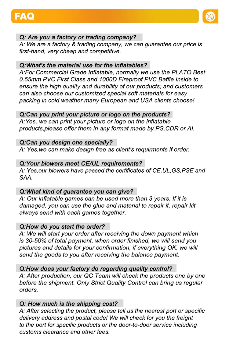 Q: Are you a factory or trading company? A: We are a factory & trading company, we can guarantee our price is first-hand, very cheap and competitive. Q:What's the material use for the inflatables? A:For Commercial Grade Inflatable, normally we use the PLATO Best 0.55mm PVC First Class and 1000D Fireproof PVC Baffle Inside to ensure the high quality and durability of our products; and customers can also choose our customized special soft materials for easy packing in cold weather,many European and USA clients choose! Q:Can you print your picture or logo on the products? A:Yes, we can print your picture or logo on the inflatable products,please offer them in any format made by PS,CDR or AI. Q:Can you design one specially? A: Yes,we can make design free as client's requirments if order. Q:Your blowers meet CE/UL requirements? A: Yes,our blowers have passed the certificates of CE,UL,GS,PSE and SAA. Q:What kind of guarantee you can give? A: Our inflatable games can be used more than 3 years. If it is damaged, you can use the glue and material to repair it, repair kit always send with each games together. Q:How do you start the order? A: We will start your order after receiving the down payment which is 30-50% of total payment, when order finished, we will send you pictures and details for your confirmation, if everything OK, we will send the goods to you after receiving the balance payment. Q:How does your factory do regarding quality control? A: After production, our QC Team will check the products one by one before the shipment. Only Strict Quality Control can bring us regular orders. Q: How much is the shipping cost? A: After selecting the product, please tell us the nearest port or specific delivery address and postal code! We will check for you the freight to the port for specific products or the door-to-door service including customs clearance and other fees.