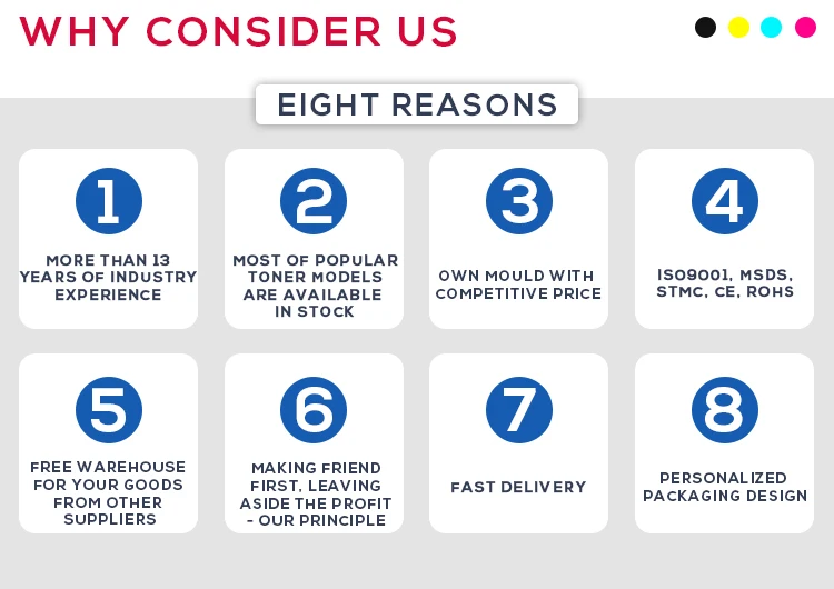 Advantages: | 1. Guaranteed Quality: Testing video is available for every toner. 2. Flexible Price: Making friends first, Leaving aside the profit. 3. Good Service: Free warehouse for goods from your other suppliers. |