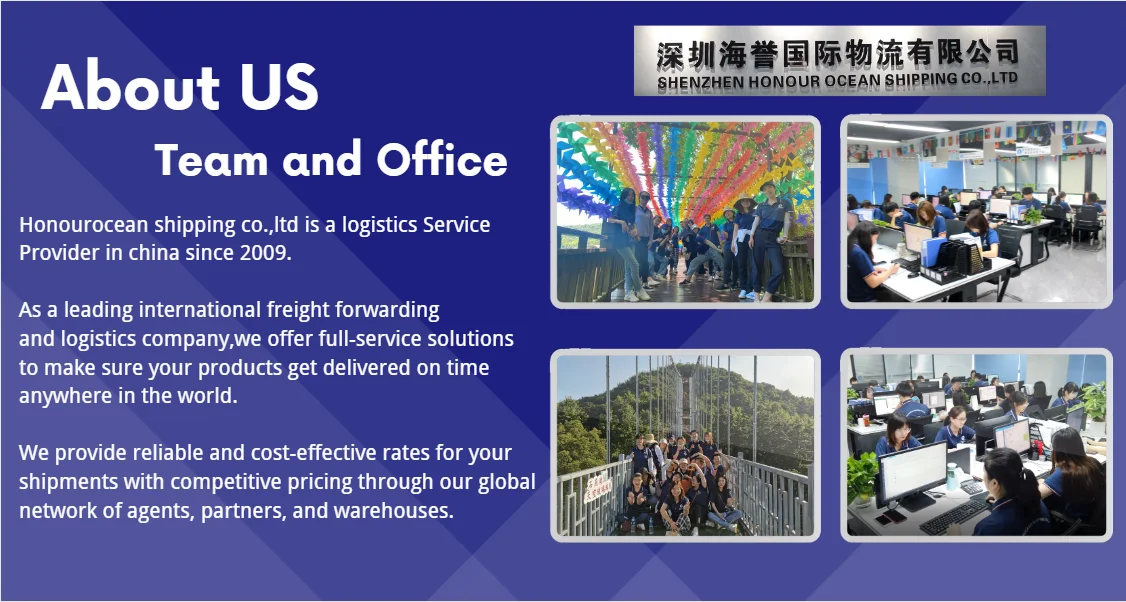 We are Honourocean International Logistics Company since 2009,with around 12 years of experience in international logistics services. We have logistics lines from China to worldwide by Air ,Sea ,Railway,DDP,DDU shipping for your choice. You can feel free to click "Contact supplier"on the right of the page to contact us for more shipping service.To save cost by shipping goods via a China shipping agent.We can help ship from China to worldwide. To get more exact shipping cost, you can prepare below goods info: Products name(better with a photo),Total weight,Carton box size,Total boxes,Shipping address We can give you professional advice about shipping and the most suitable shipping solutions based on your inquiry. |