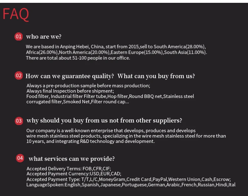Its main business is specialized in the production of various specifications of filter screen, copper filter screen, stainless steel filter element, folding filter element, barbecue net, smoke pipe, stainless steel mesh basket, fan protective cover, steel wire mesh, protective net and other metal mesh products.