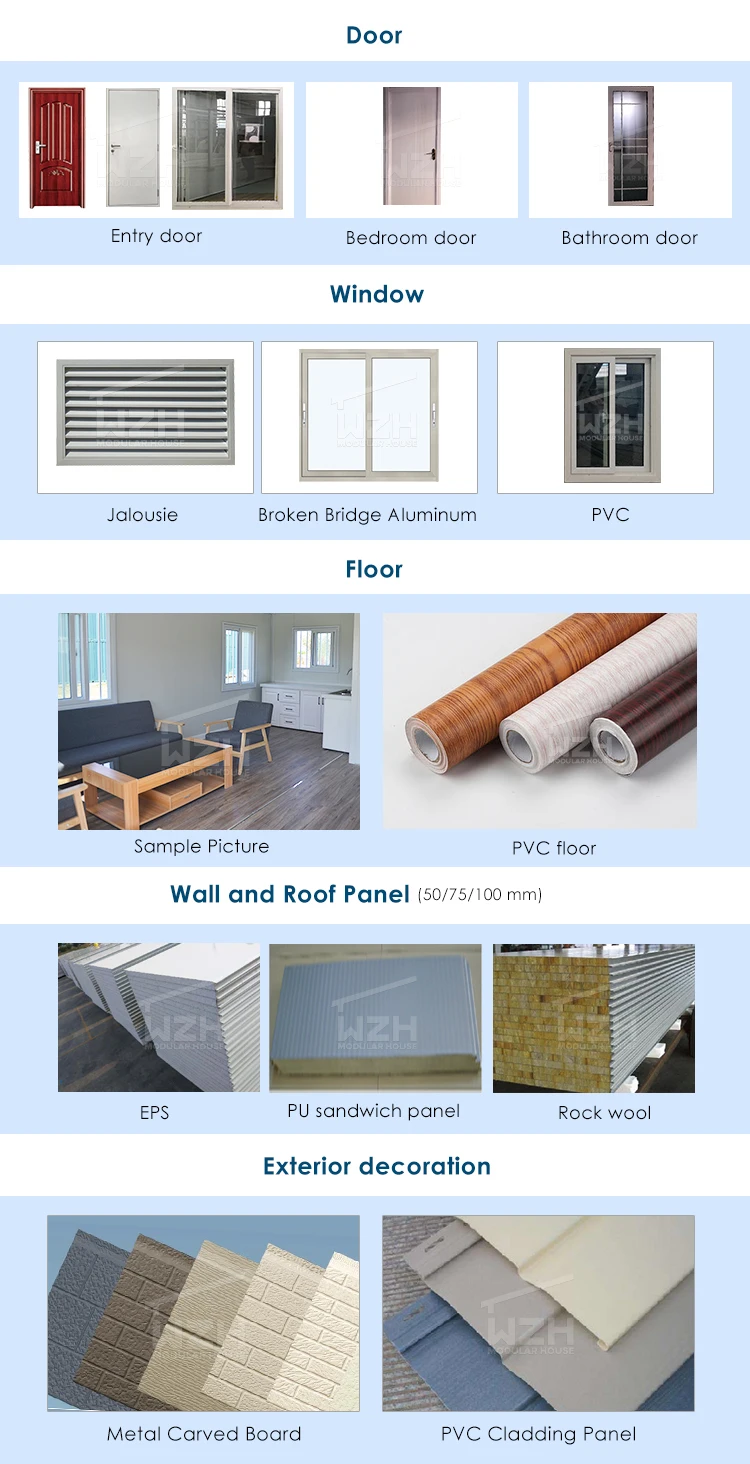 Roof | 3-4mm Hot galvanized steel structure with 4 corner casts and (1)Galvanized steel roof covering; (2)50mm -70mm eps sandwich panel or PU sandwich panel ; (3)50mm -70mm eps sandwich panel or PU sandwich panel ; |