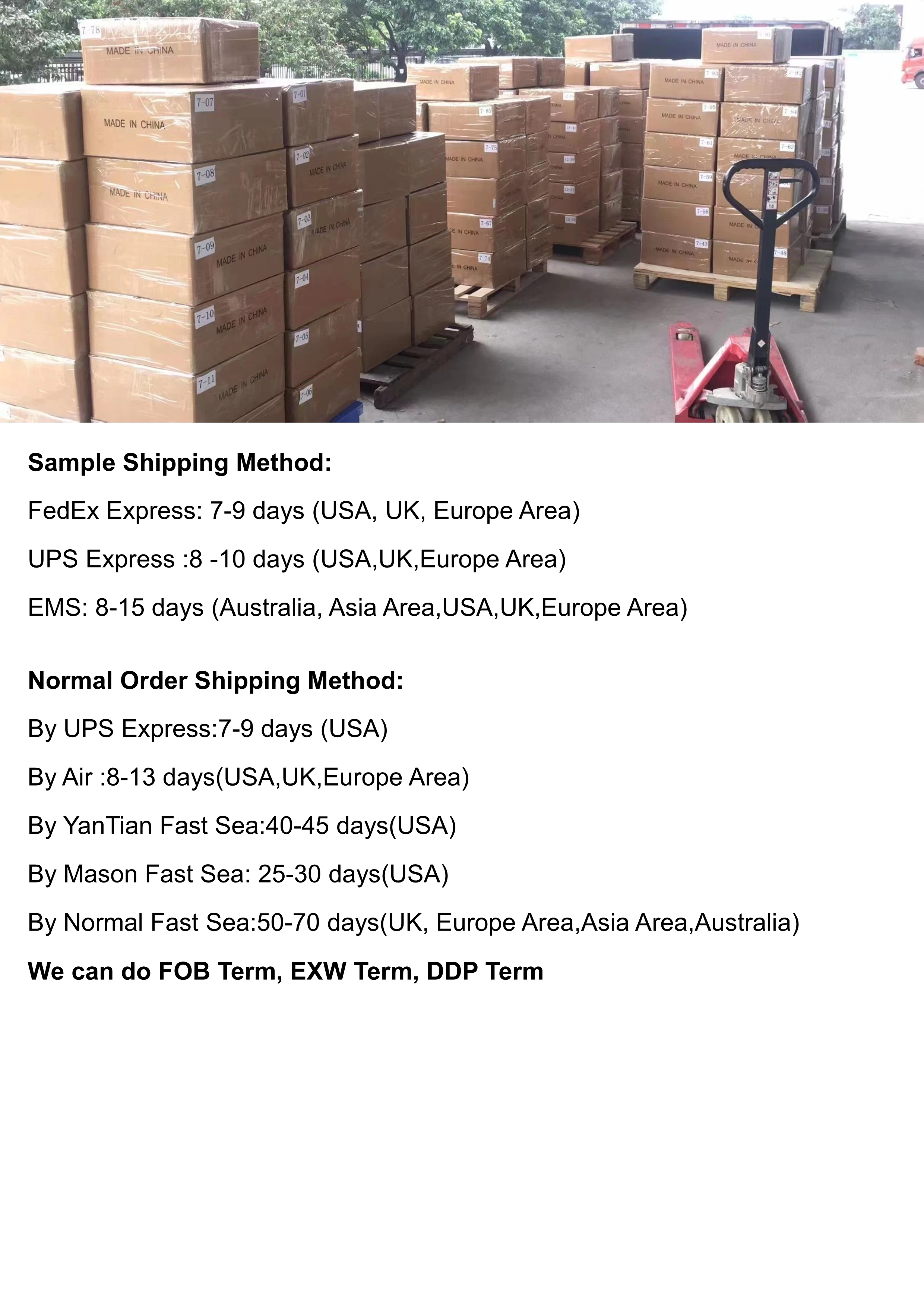 A: 1.Sample order time : about 3 to 7 days according to the complexity of the sample . 2. Bulk order time : about 10 to 20 days, depending on product order details . 3. If urgent ,we can speed up as we are manufacturer of owning factory .