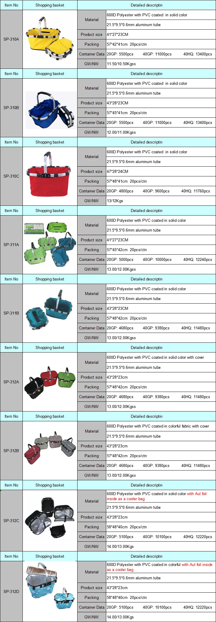 Material | Double Layer 600D Polyester+ Inside pocket(size:15x20cm)+5pcs PP bottom + EVA handle | Size | Open size:46*27*23cm | ||