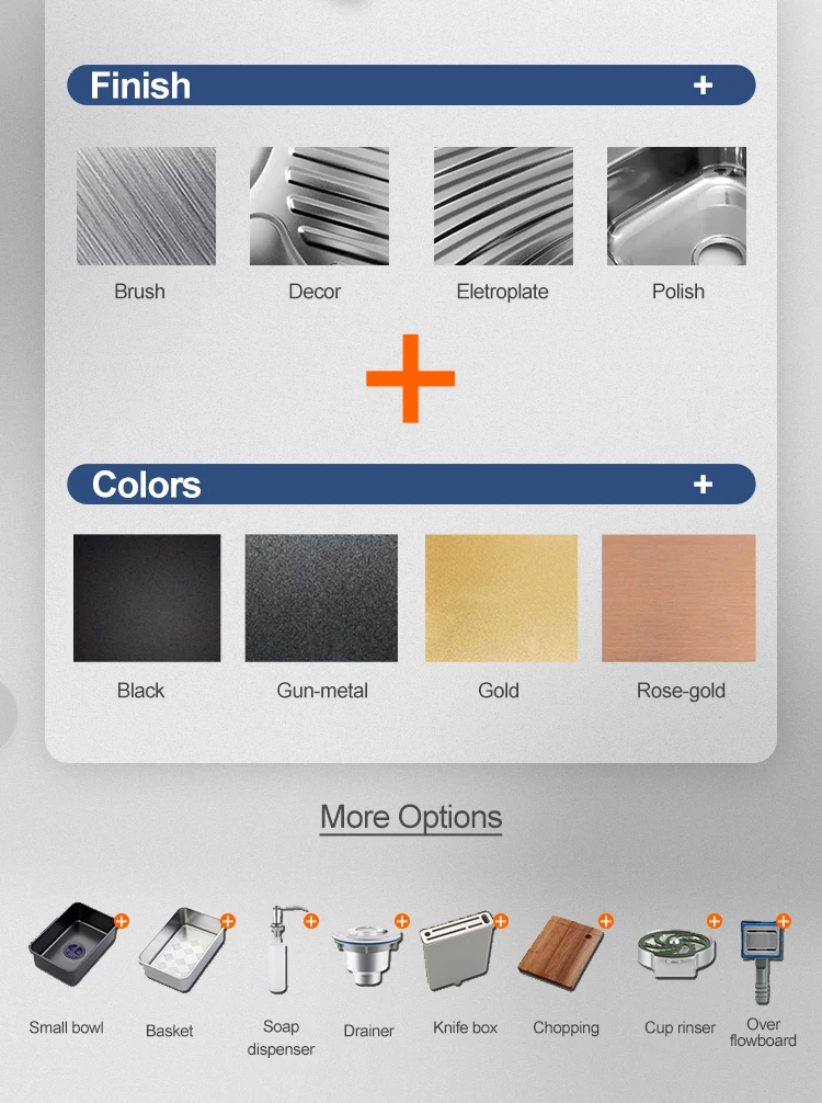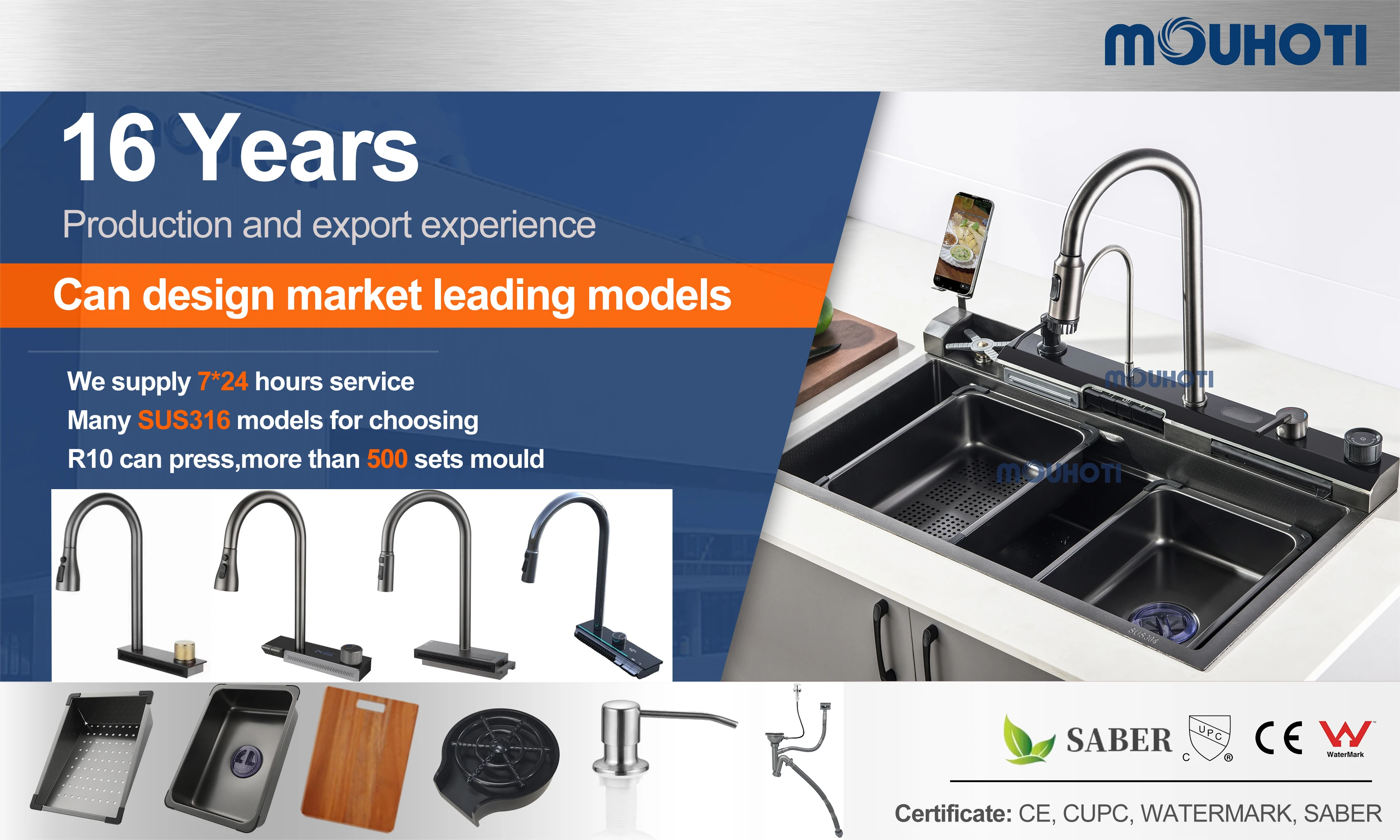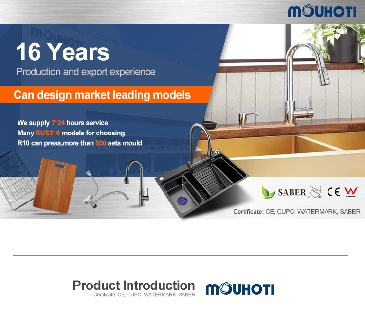 We are manufacturer With more than 15 years export experience in producing kitchen sink and faucet with accessories. Our products are unique, diverse and intelligent. We have our own pvd colors, brush, laser cutting,polish and mould process department.