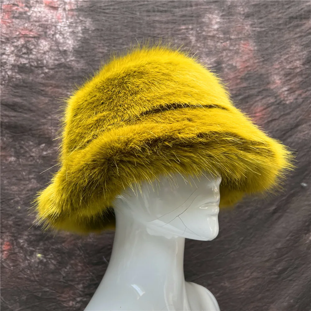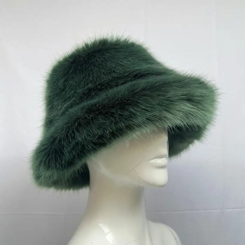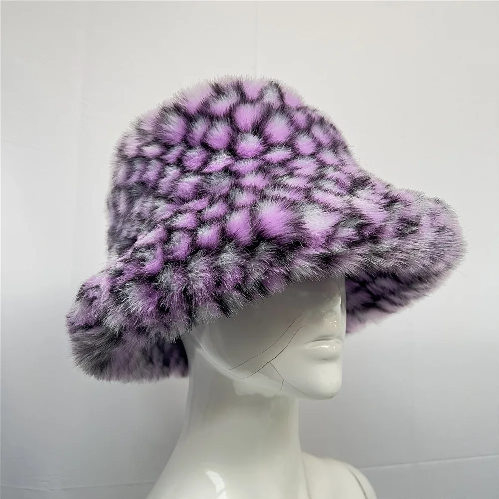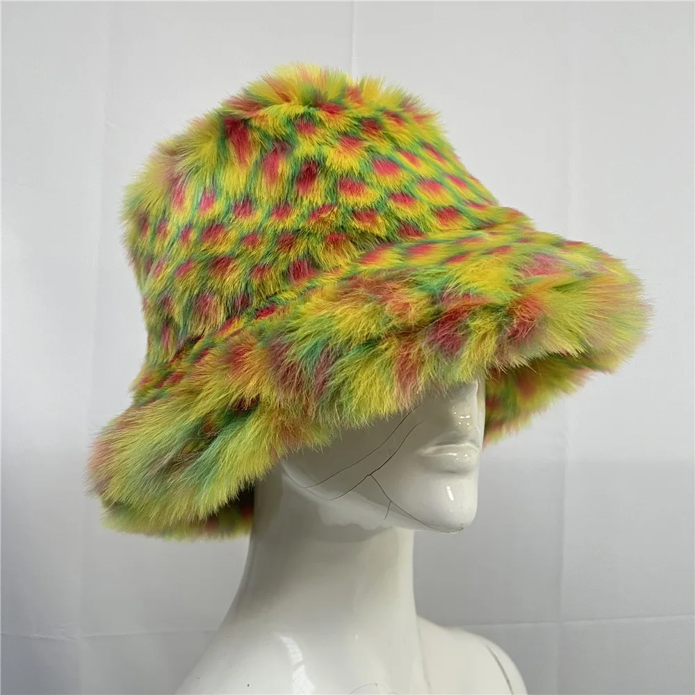 Tie Dye Plush Color Blocking Faux Fur Bucket Hat for Women Fuzzy Party Warm Soft Multi Colors Pattern Fox Fur Winter Hat