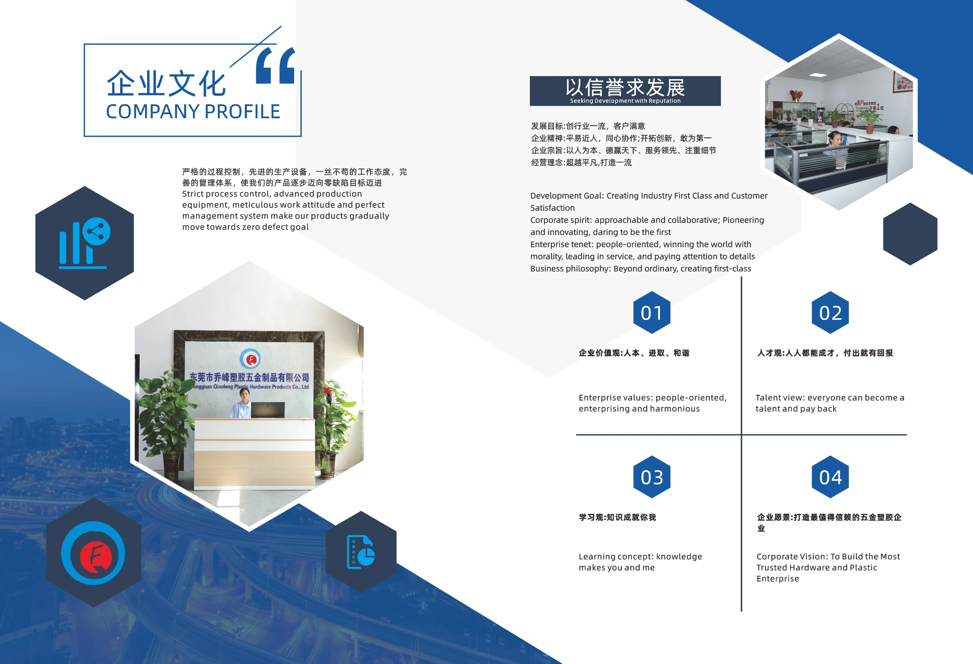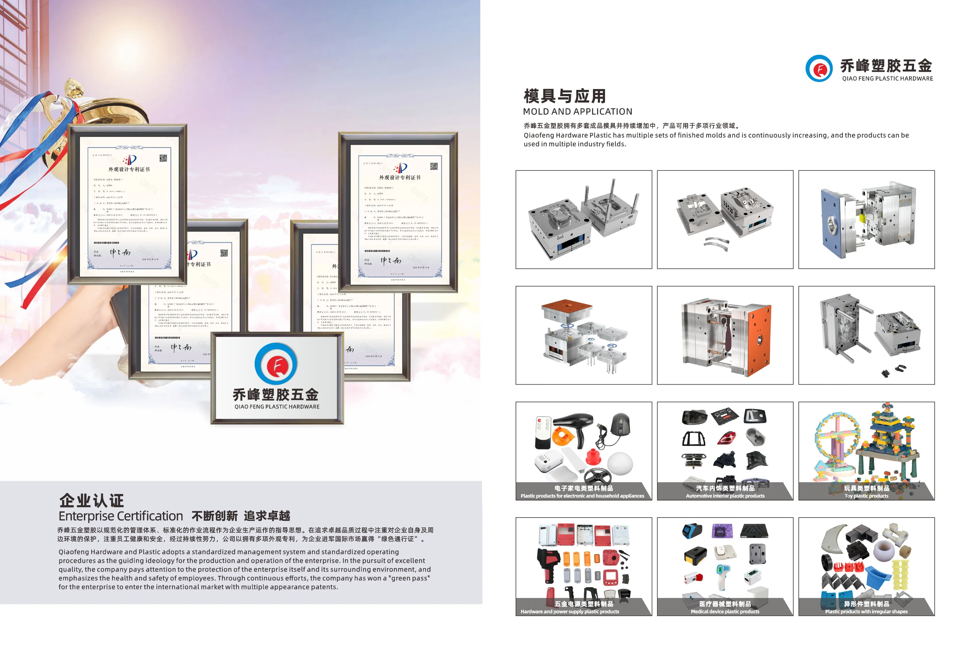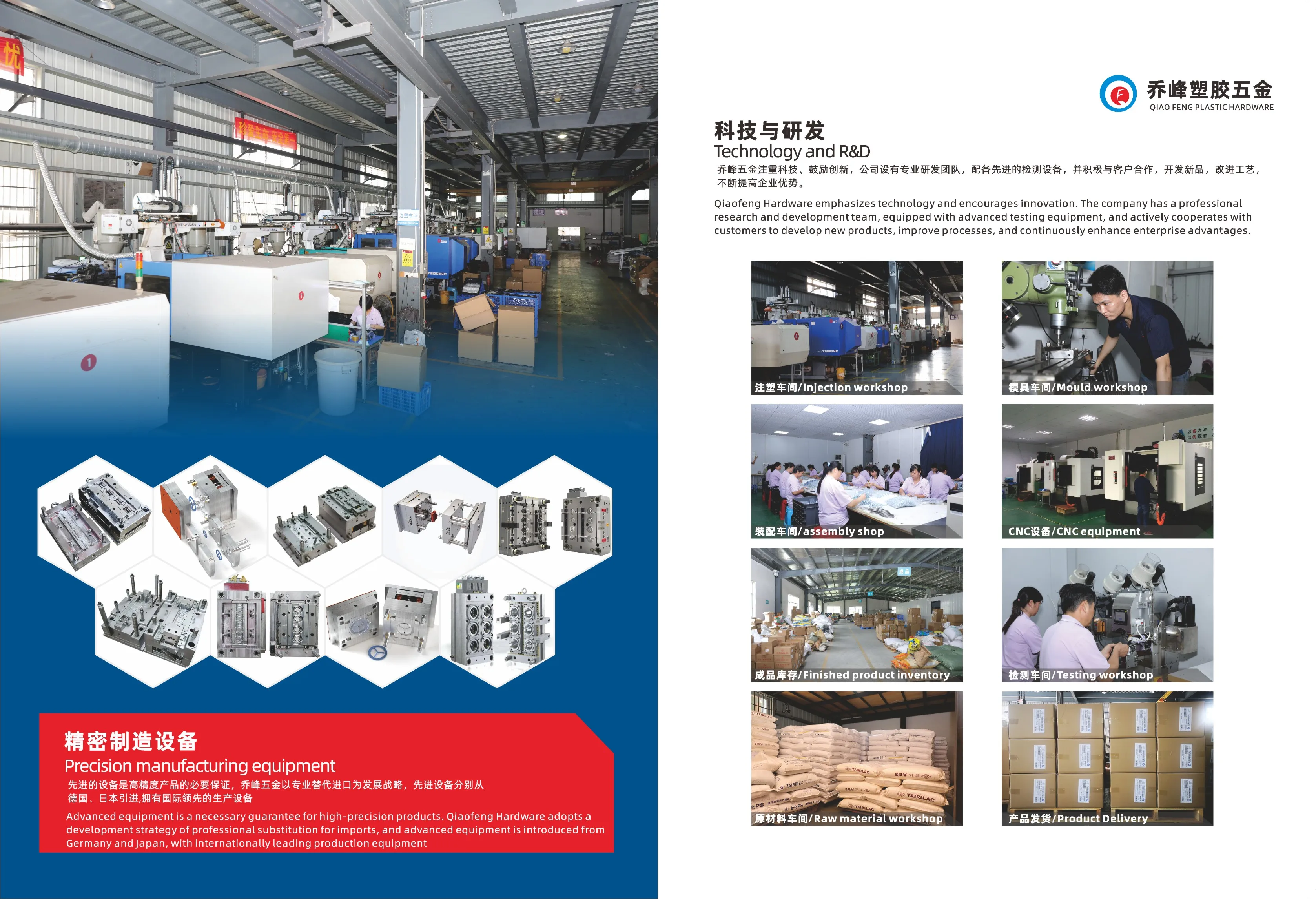 Dongguan Qiaofeng Plastic Hardware Products Co., Ltd. is a plastic mold design and injection molding processing enterprise integrating design, production, processing and sales. The company was established in 2008 and has 15 years of production and processing experience. The total area of the factory building is 5000 square meters More than square meters, nearly a hundred employees. Mainly engaged in plastic mold design/production, injection molding processing, home furnishing, lighting, home appliances, electronics, toys, logistics packaging plastic products and furniture hardware accessories production and sales. The company has a professional technical team composed of dozens of senior mold engineers, structural designers and more than a dozen mechanical engineers and quality engineers.