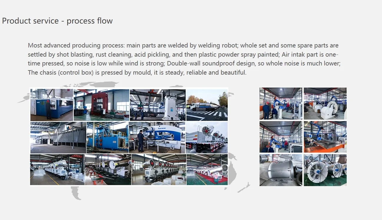 Water spray fog cannon machine can be used for urban demolition, excavation area of thermal power plant power generation, port terminal, urban air pollution, excessive dust area, metallurgy, chemical, coal, steel, buildings, gardens, public places and otherplaces dust spray, cooling.