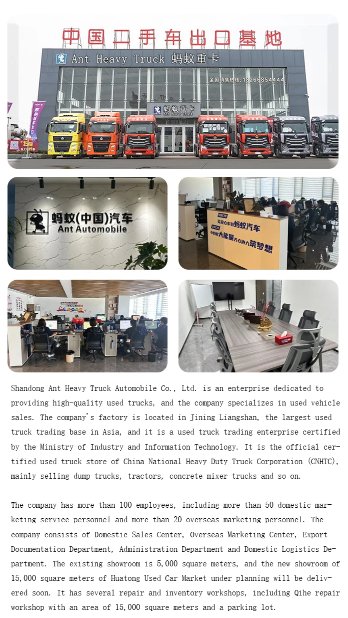 Shandong Ant Heavy Truck Automobile Co., Ltd. is an enterprise dedicated to providing high-quality used trucks, and the company specializes in the sale of used vehicles. The company's factory is located in Jining Liangshan, the largest used truck trading base in Asia, and is a certified used truck trading enterprise by the Ministry of Industry and Information Technology. We have subsidiaries in Jinan, Jining, Shandong Province, Hong Kong, Singapore and Uzbek Russia. It has spare centers in Jinan, Jining and Dezhou, and in May 2024, it opened the official experience store of China National Heavy Duty Truck (CNHTC) in Liangshan, Jining. It is the first used car store officially certified by China National Heavy Duty Truck (CNHTC), mainly engaged in Heavy Duty Truck (HDT), Shaan Automobile (SAIC) tractors, dump trucks, mixer trucks, and loaders, excavators and other construction machinery.