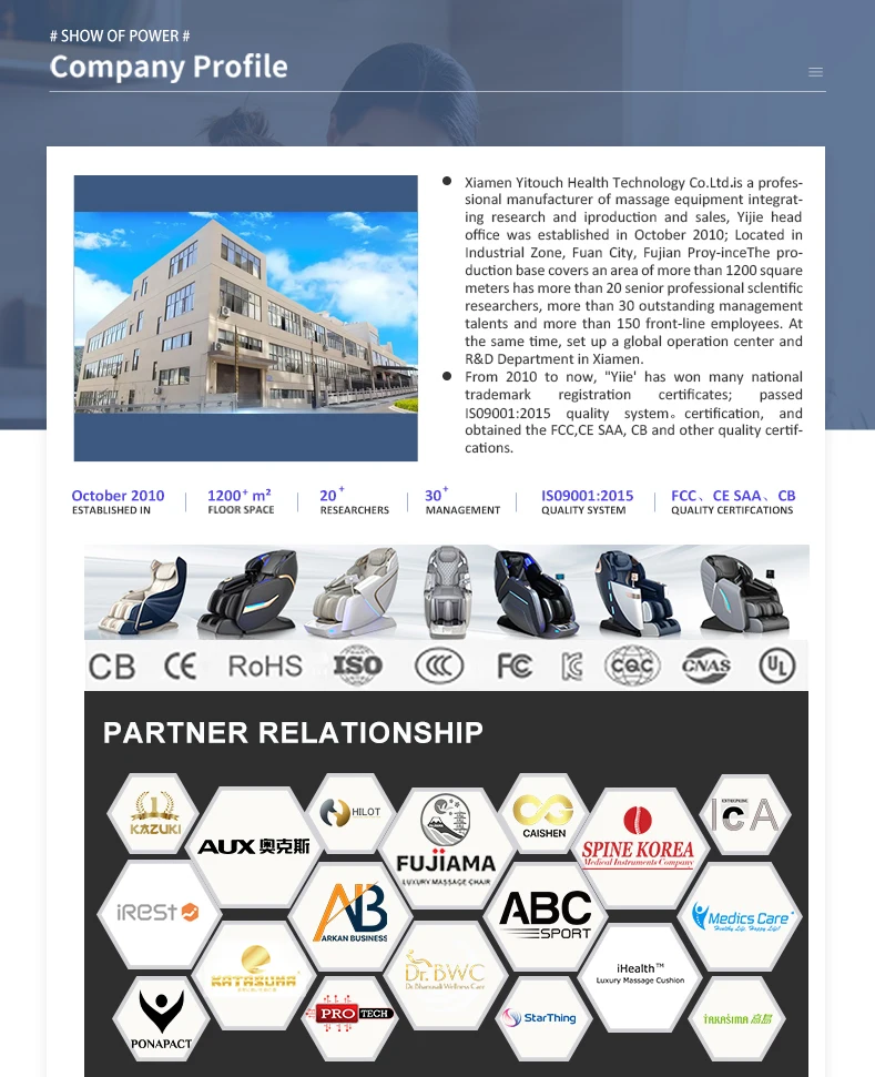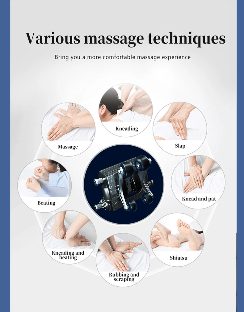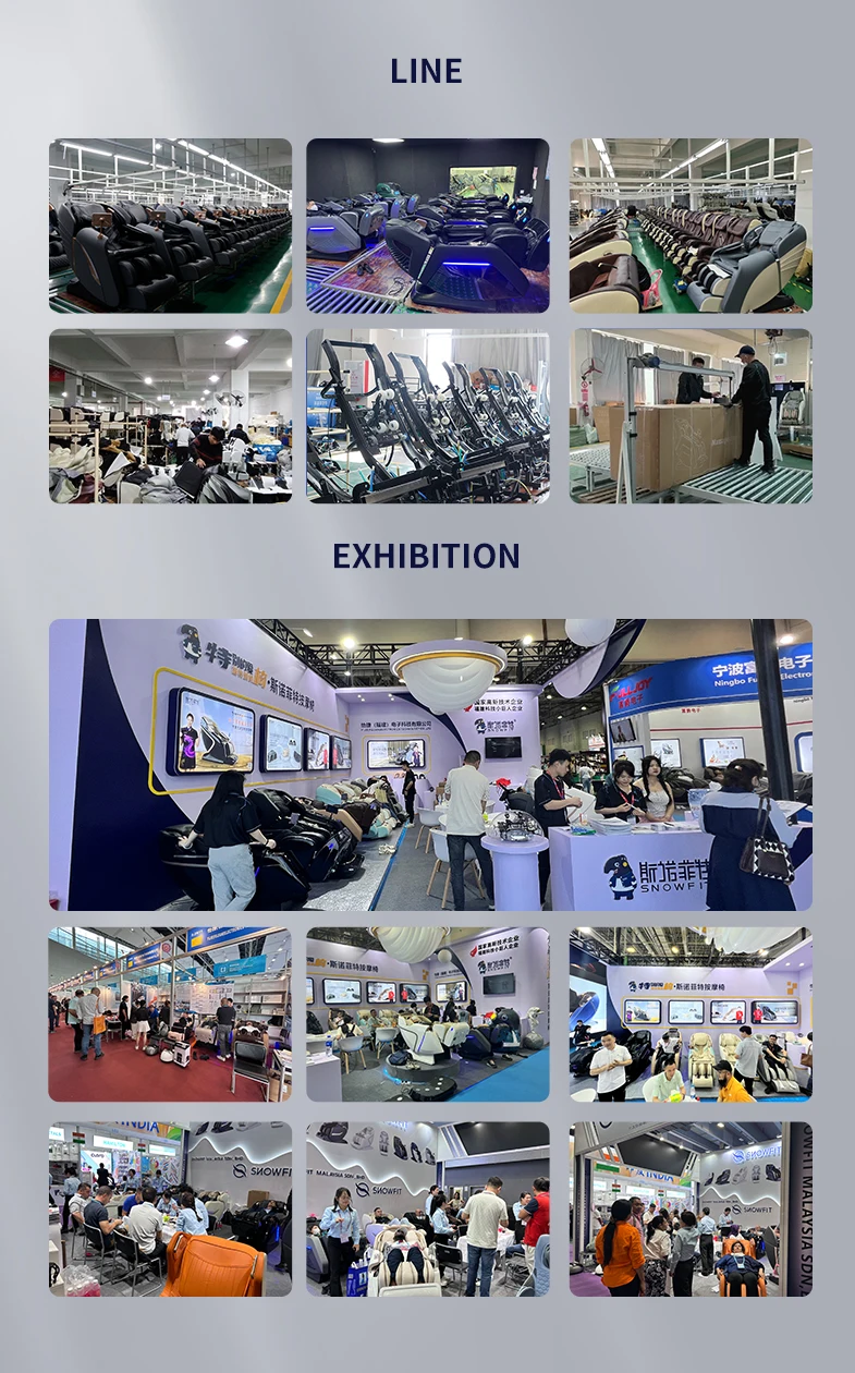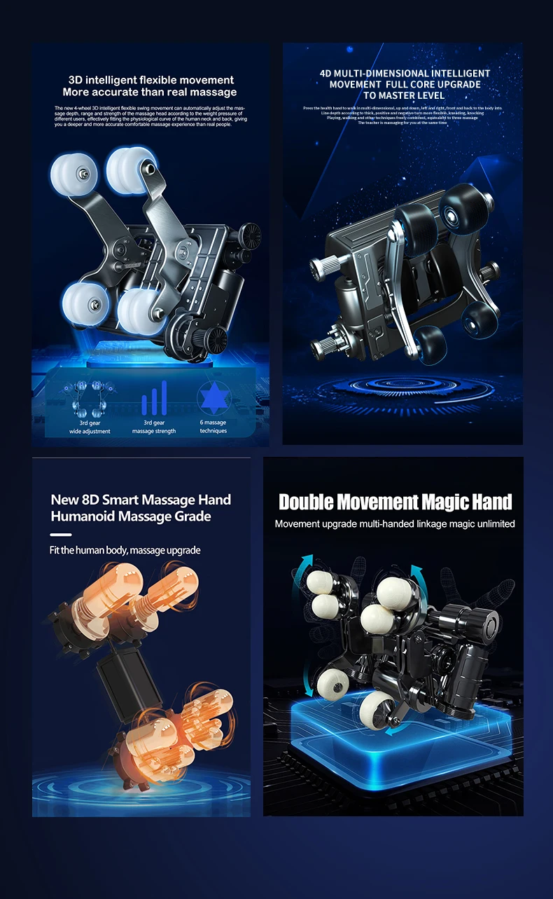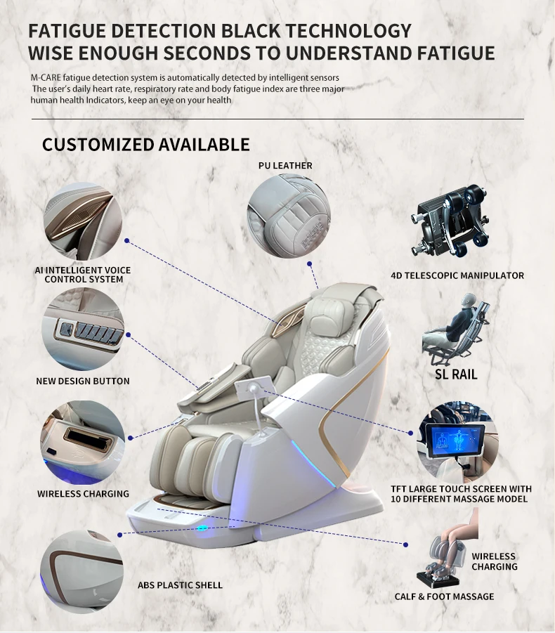 1. 4D Manipulator (Push Forward) 2. Negative Ion Purification 3. Wireless Charging 4. Calf Airbags Kneading 5. Calf Massage Roller 6. Health Detection 7. Voice Control 8. 7 Inch Full Screen Touch Controller 9. ABS Shell 10. Armrest Shortcut Key 11. USB ChargingPort 12. Leg-rest Angle Electrically Adjust Separately Separately 13. Electrically Leg-rest Extend and Retract Separately 14. Thai Stretch 15. Slide the track forward 16. Automatic Shoulder Position Detection 17. SL Track 18. 6 Massage Manipulations:Kneading,Massage, Flap, Knock, Kneading & Knock, Shiatsu 19. 10 Automatic Massage Programs 20. 6 Levels Speed 21. 6 Levels Airbags Intensity 22. Full Body Airbags Massage: Shoulder, Waist, Arm, Hip, Calf, Foot 23. Foot Bottom Roller + Gua Sha 24. PE Frame 25.Zero Gravity 26. Back Heating 27. LED Lamp 28. Bluetooth Speaker 29. Adjust the Manipulator Width 30. Choose Massage Area 31.Backrest Angle Electrically Adjust 32. Choose Massage Time 33. With Castors, Easy To Move 34. Safety Voltage 35. AI Chip 36.Silicone massage point 37.Support language settings UPDATE: 1.Pure Injection-Molded Shell 2.Three-fold Mechanism Certified Pure Music. |