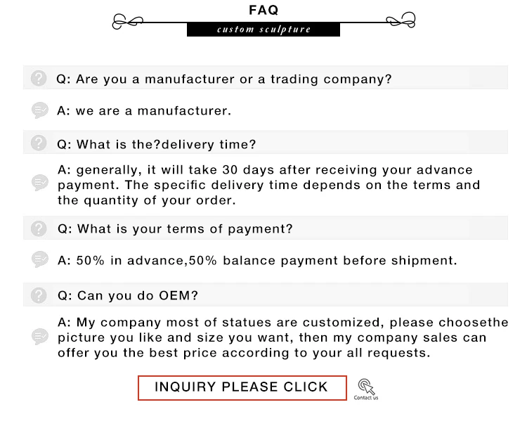 Delivery | Small sculptures in 30 days usually. Huge sculptures will take more time. |